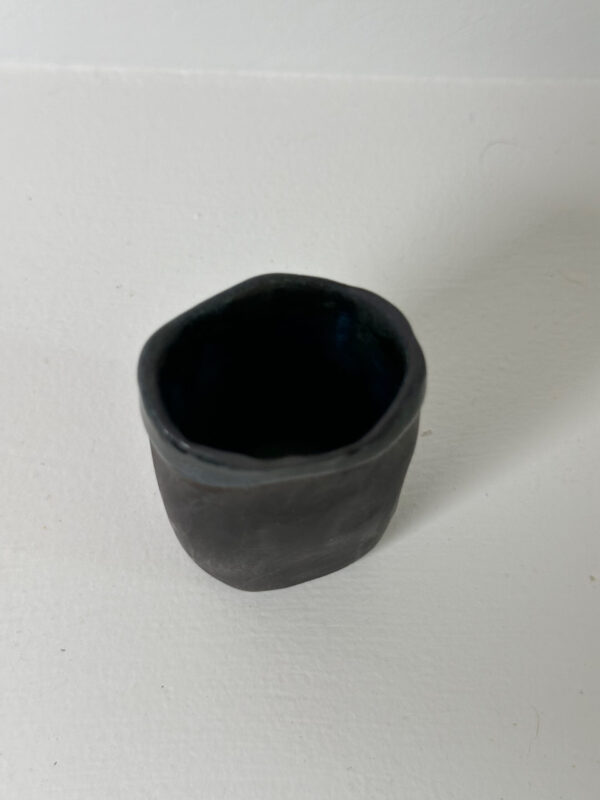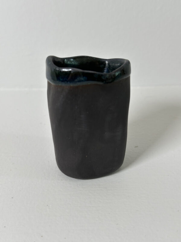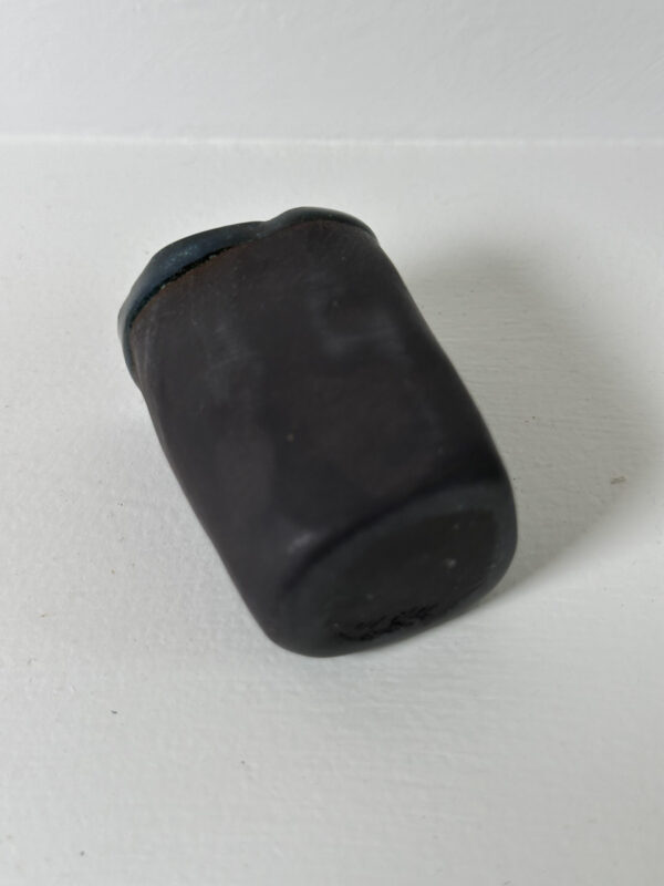 Black porcelain toothpick/matches holder, wheel-thrown from black porcelain and coated with “Oribe” glaze.