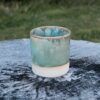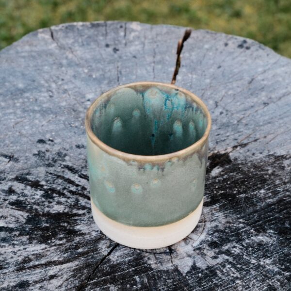 Stoneware cup/candle holder, wheel-thrown from white stoneware and hand-painted with “Aurora Green” and “Muddy Waters” glazes.