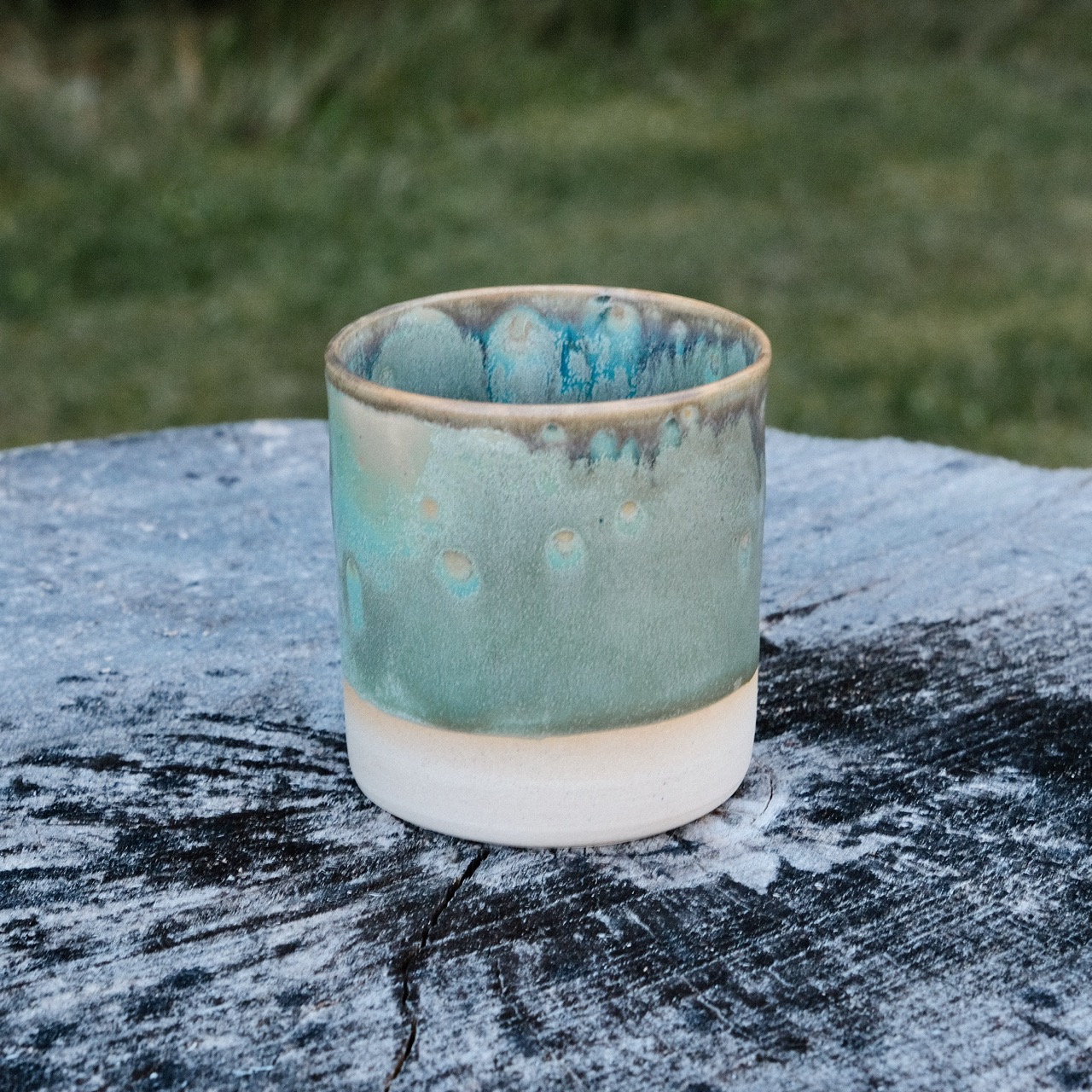 Stoneware cup/candle holder, wheel-thrown from white stoneware and hand-painted with “Aurora Green” and “Muddy Waters” glazes.