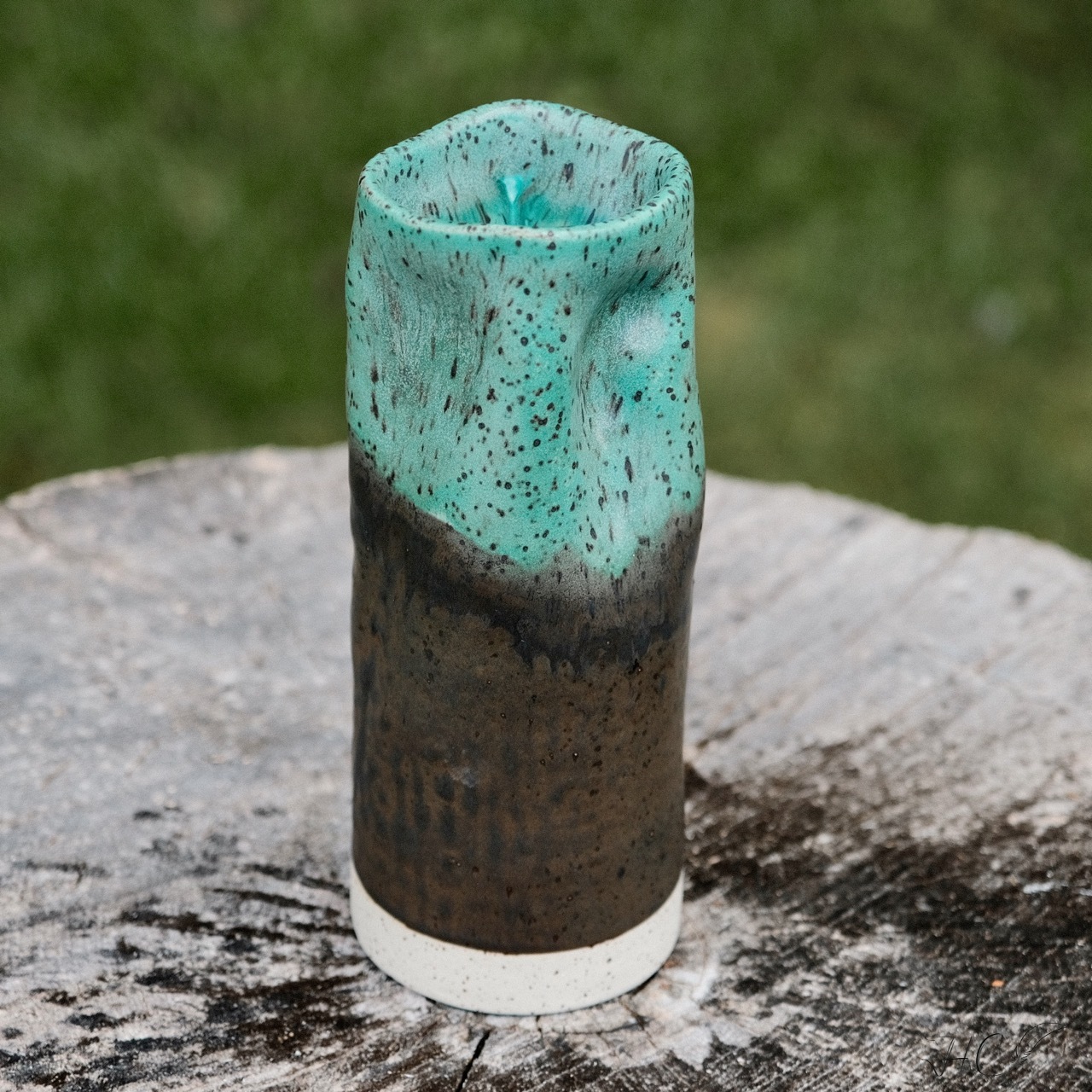 Stoneware dimpled vase, wheel-thrown from speckled stoneware and hand-painted with “Satin Patina” and “Rusted Iron” glazes.