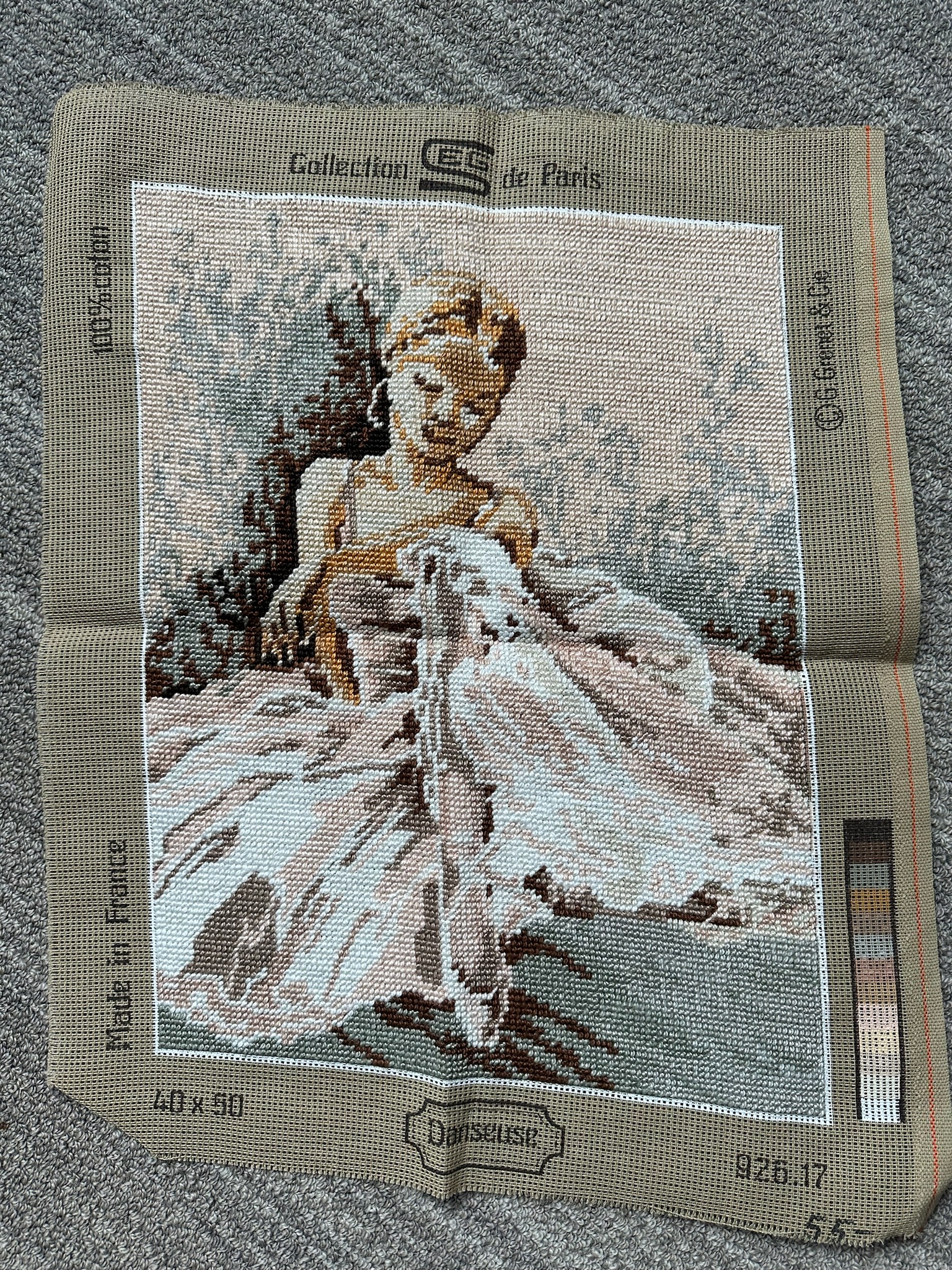 Danseuse (Dancer) is a cotton canvas created by SEG de Paris in France. The needlepoint was meticulously cross-stitched by hand over many months. The final product was professionally framed by TRULY YOURS CUSTOM FRAMING, INC. It includes the UV70 glass which protects the needlepoint from elemental damage and provides the following: