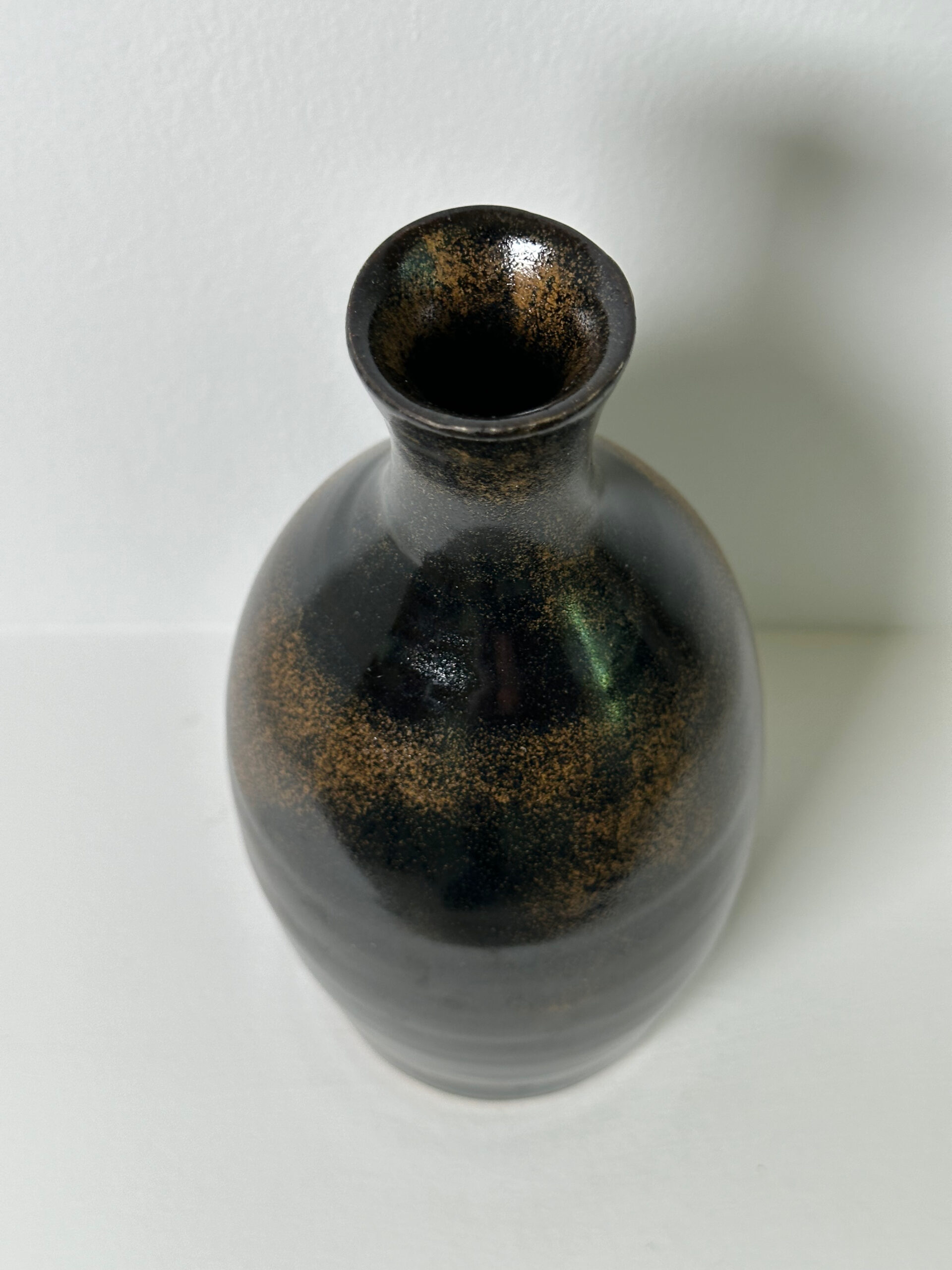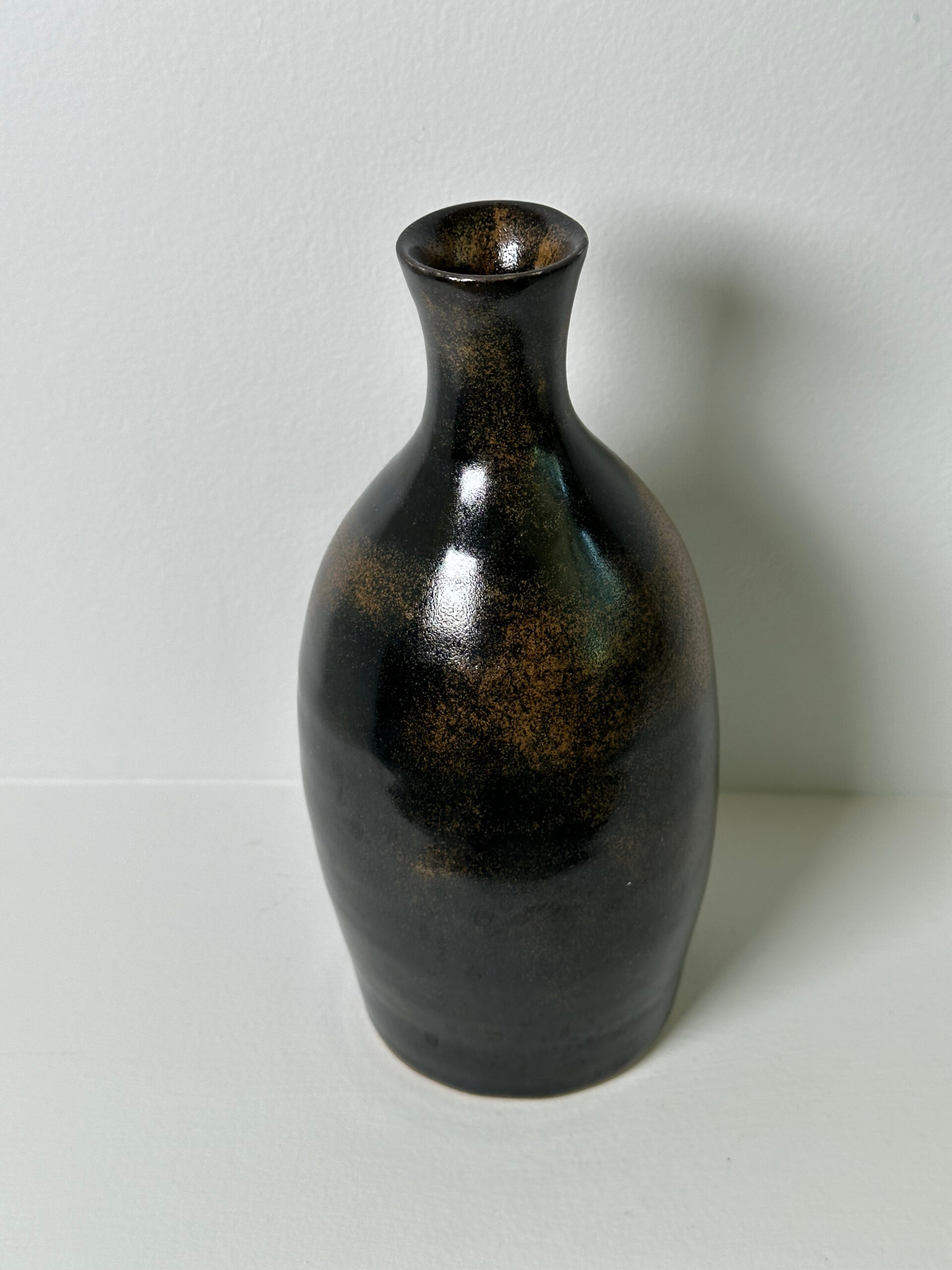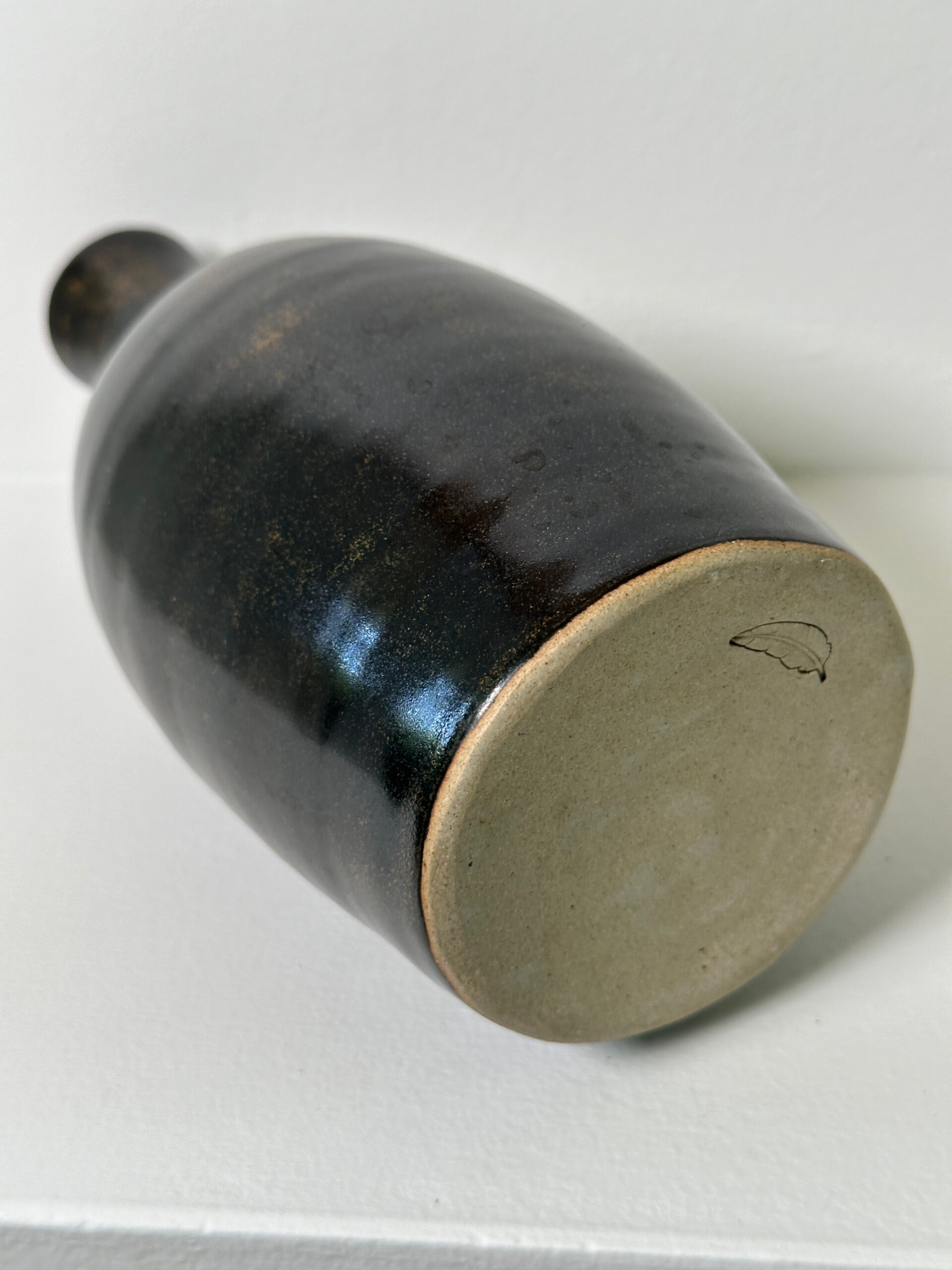 Draycott stoneware bottle/vase, wheel-thrown from white stoneware and coated with “Tenmoku” glaze.
