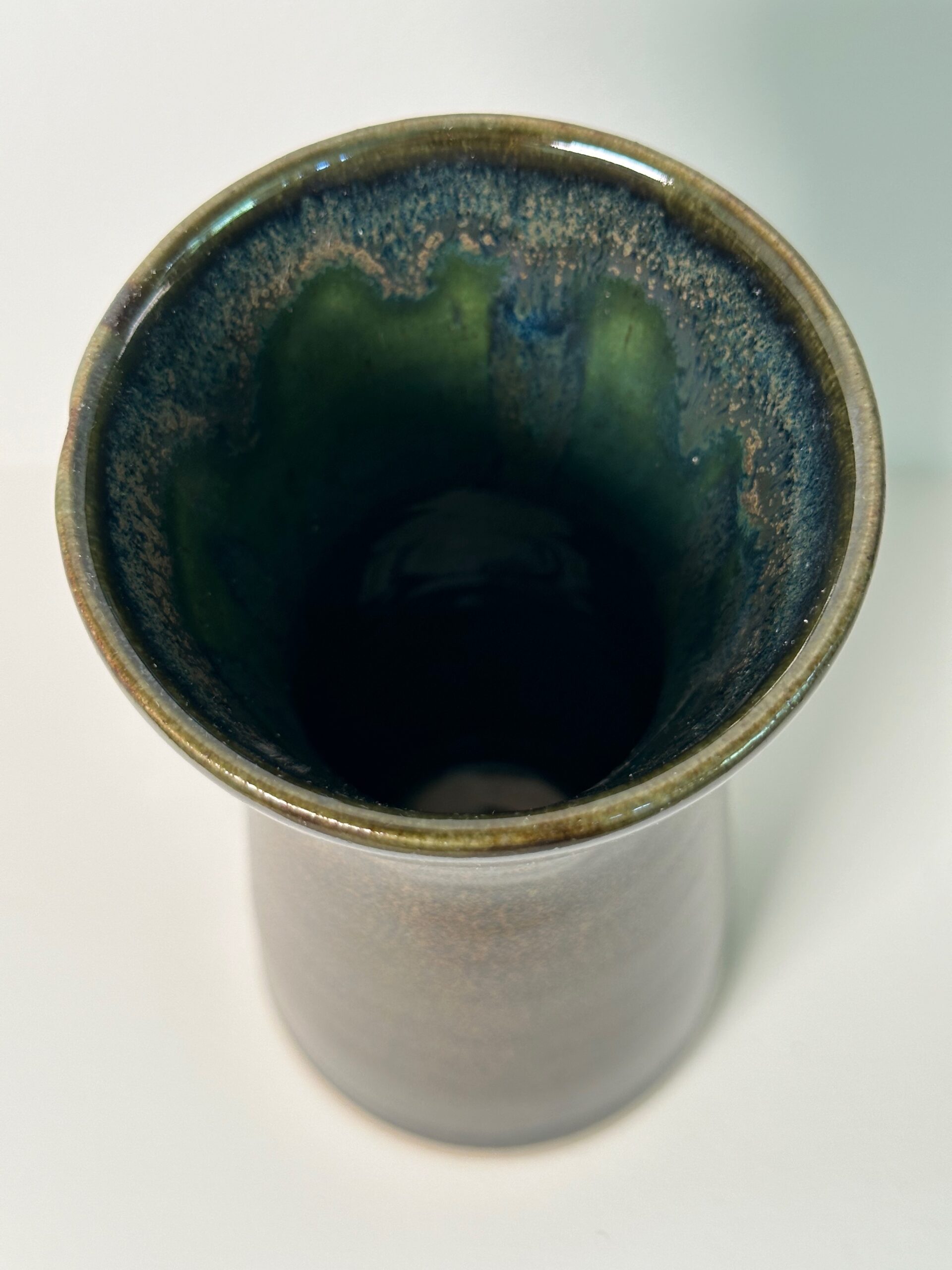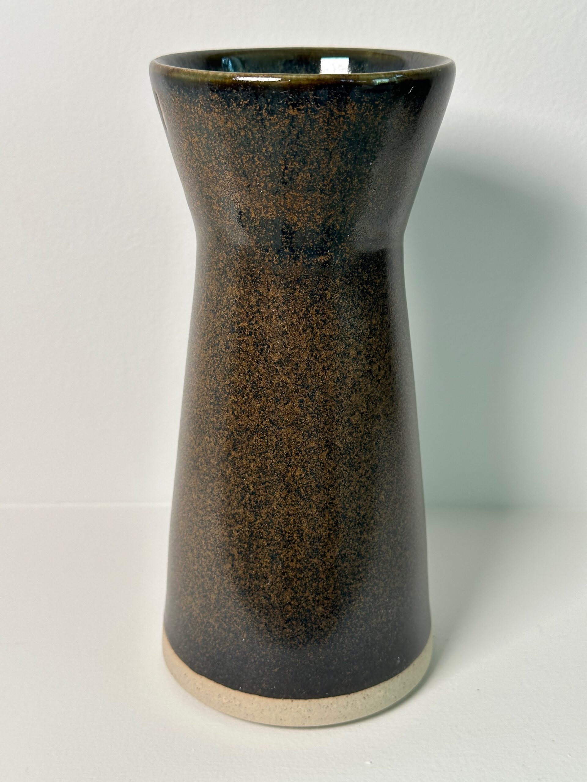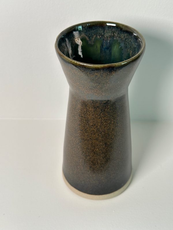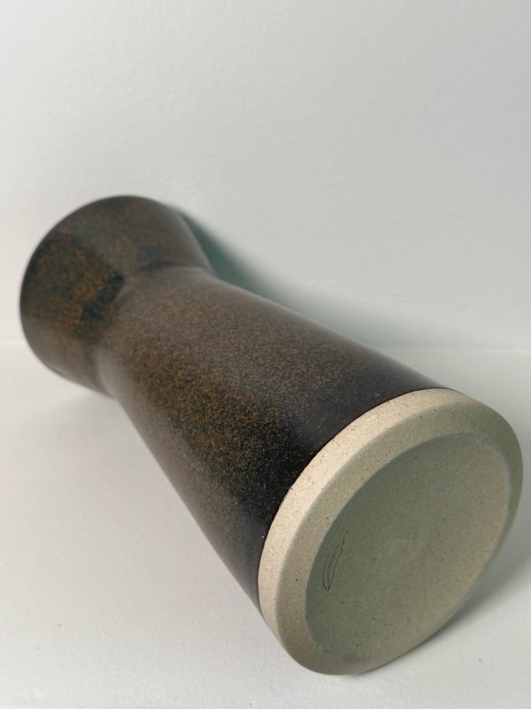 Draycott stoneware vase, wheel-thrown from white stoneware and coated with “Oribe” and “Tenmoku” glazes.