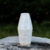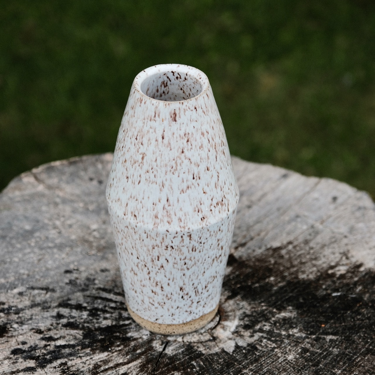 Speckled stoneware inverse hourglass vase, wheel-thrown from speckled stoneware and coated with “Bright White” glaze.