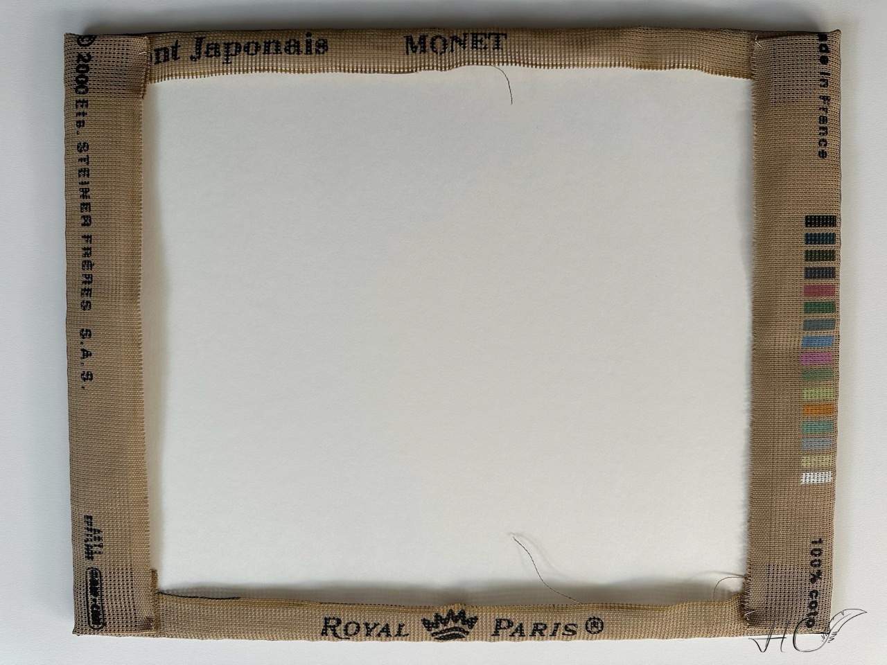 Claude Monet’s “Le Pont Japonais” (The Japanese Footbridge) is a 100% cotton canvas created by Royal Paris manufactured in France. The needlepoint was meticulously cross-stitched by hand over many months. The final product was professionally stretched, but left unframed.