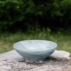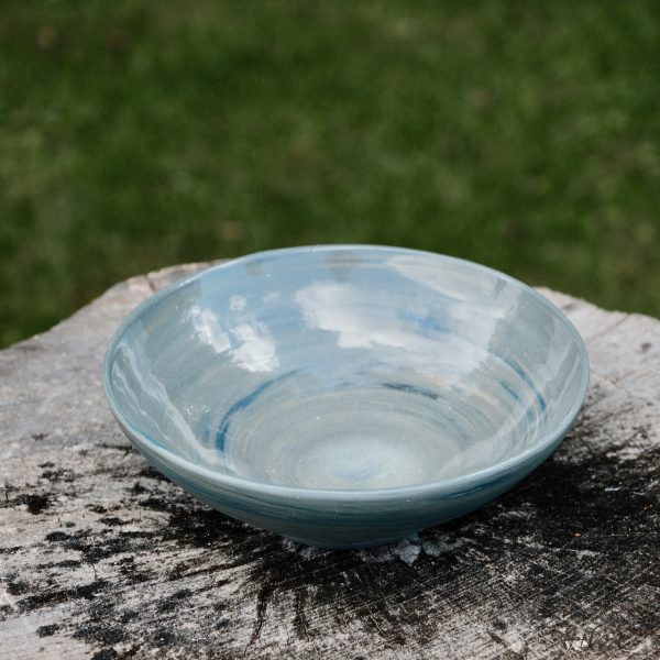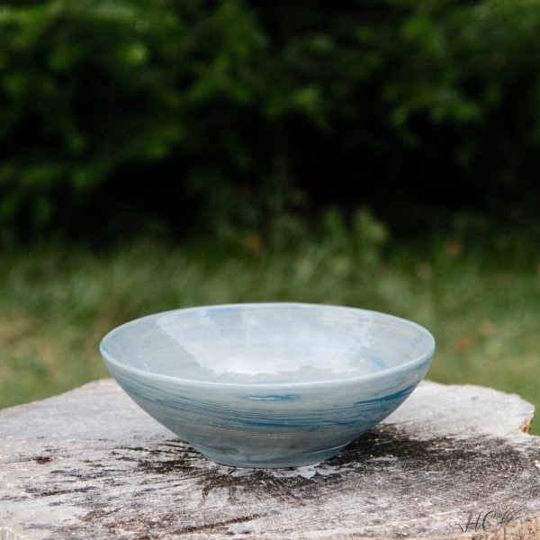 Large marbled porcelain bowl, wheel-thrown from marbled blue, black, yellow and white porcelain and coated with “Crystal Clear” glaze.
