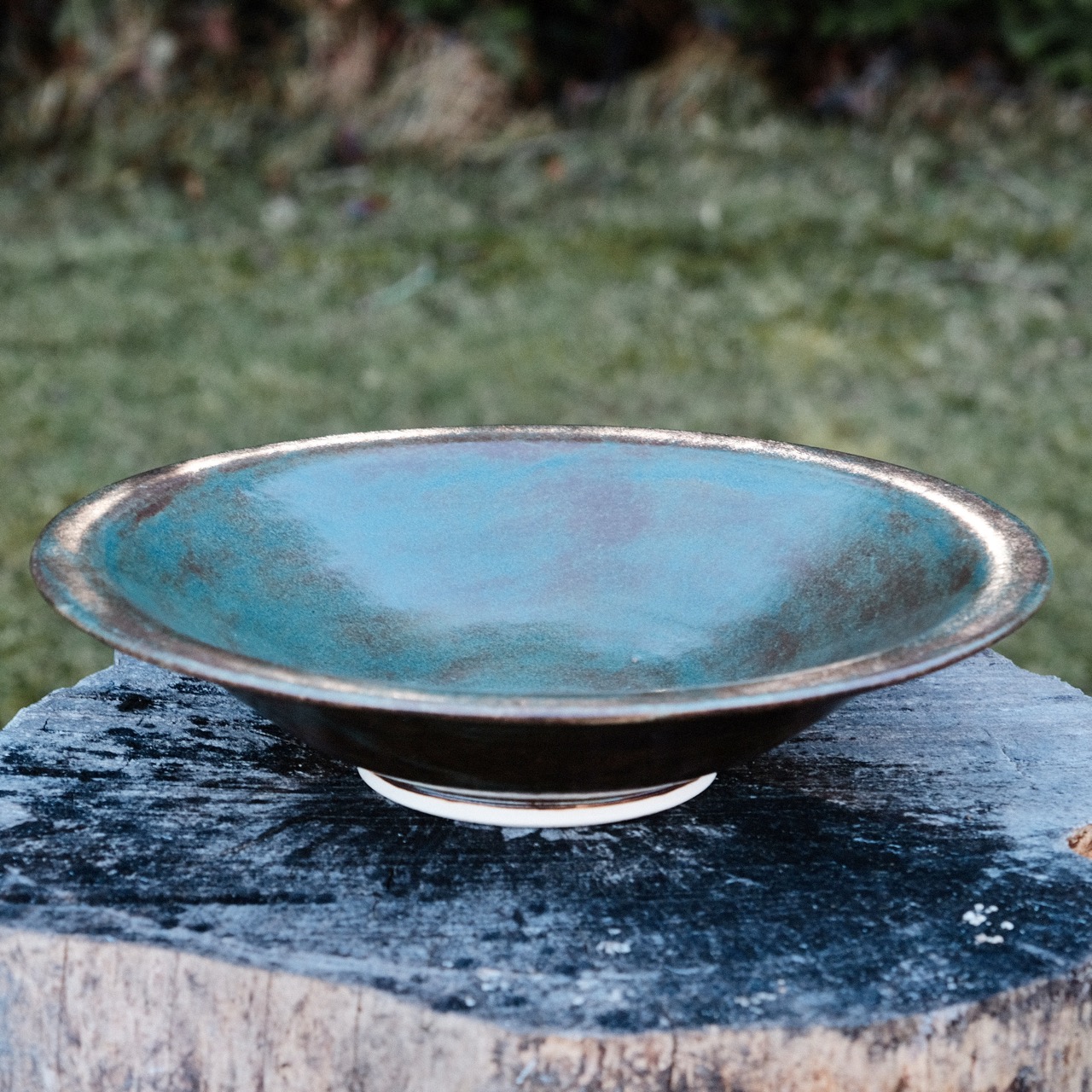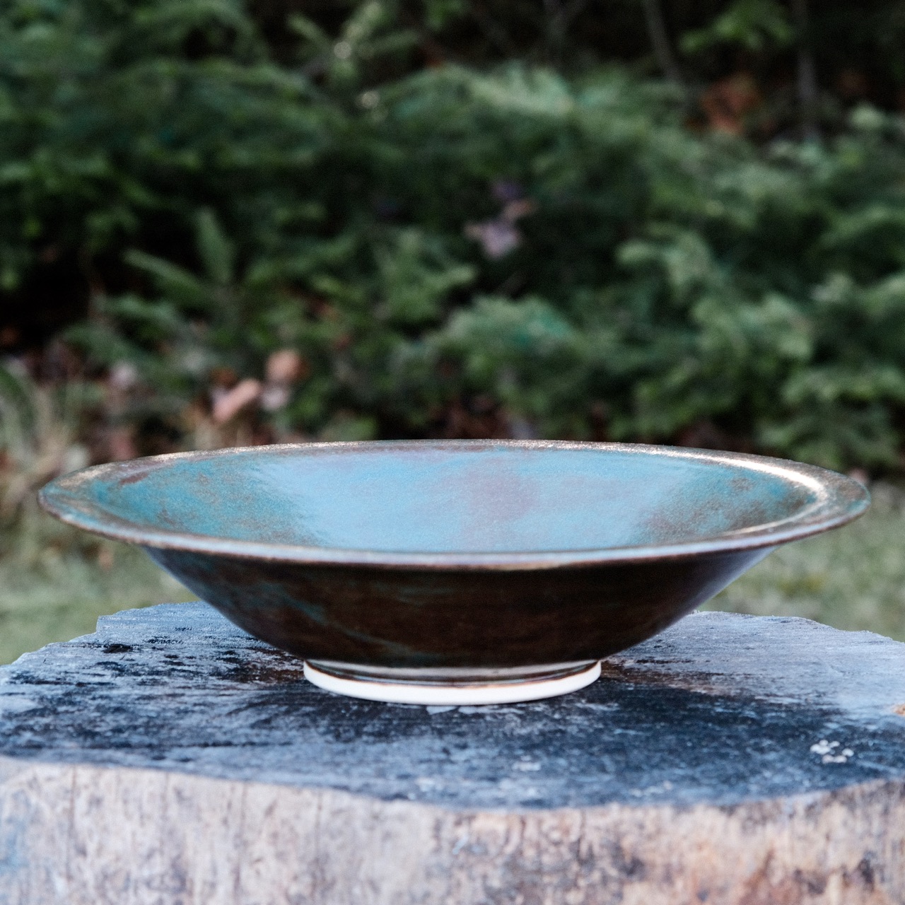 Large platter with flat rim, wheel-thrown from white stoneware and hand-painted with “Matcha Gloss Shino” glaze.