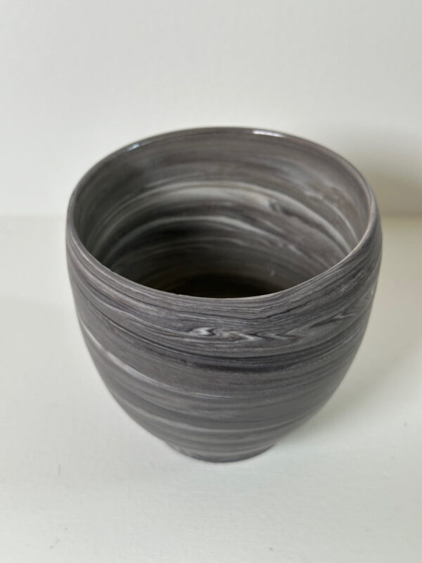 Marbled black and white porcelain cup/dessert bowl, wheel-thrown from marbled black and white porcelain and coated with “Transparent” glaze.