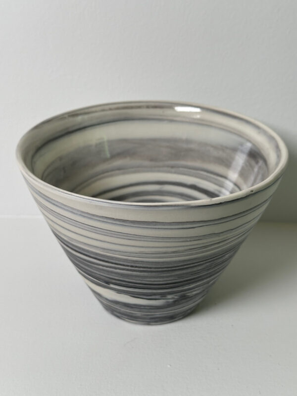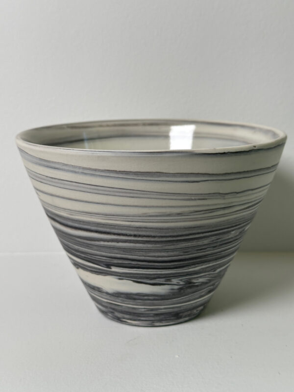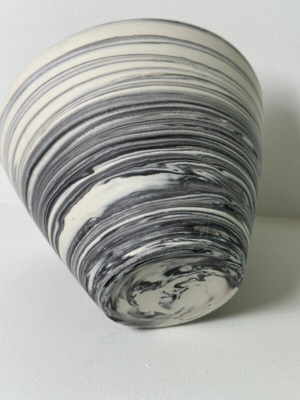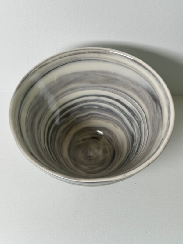 Marbled black & white porcelain bowl, wheel-thrown from marbled white and black porcelain and coated with “Transparent” glaze.