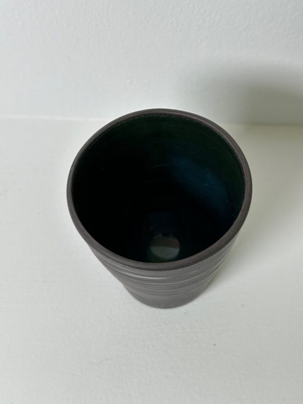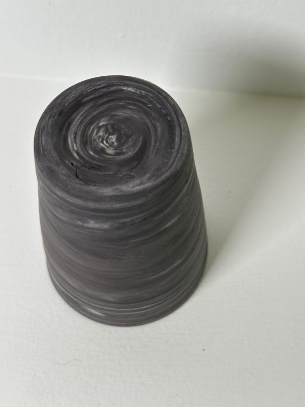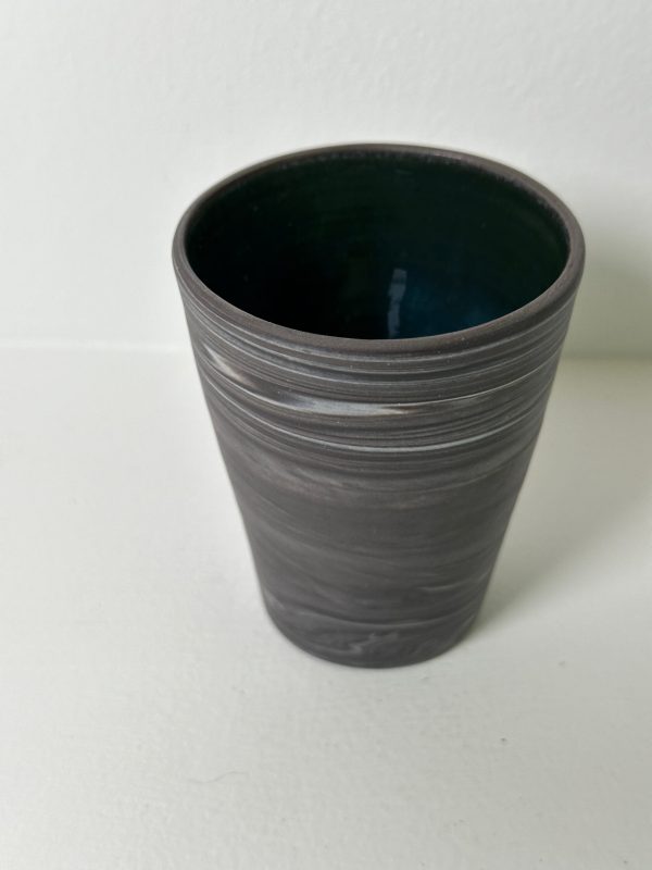 Marbled black & white porcelain cup/tumbler/vessel, wheel-thrown from marbled black and white porcelain and coated with “Oribe” glaze.