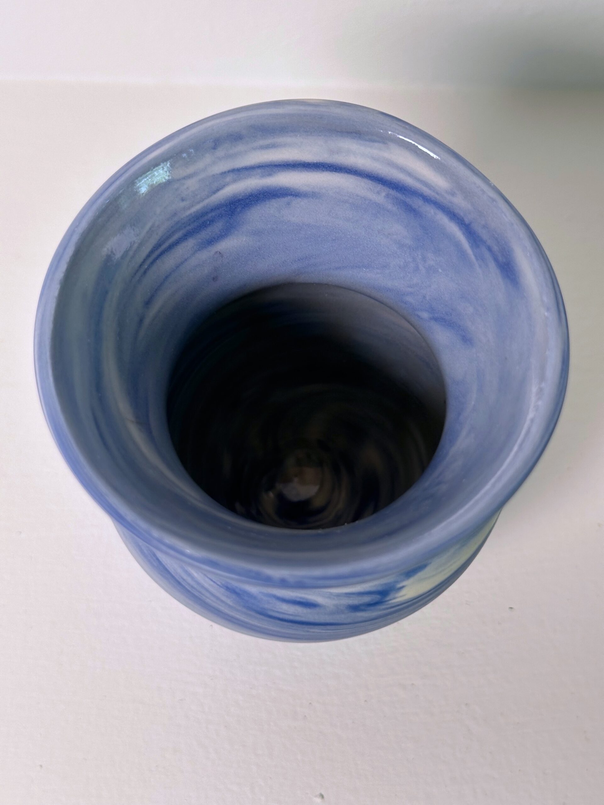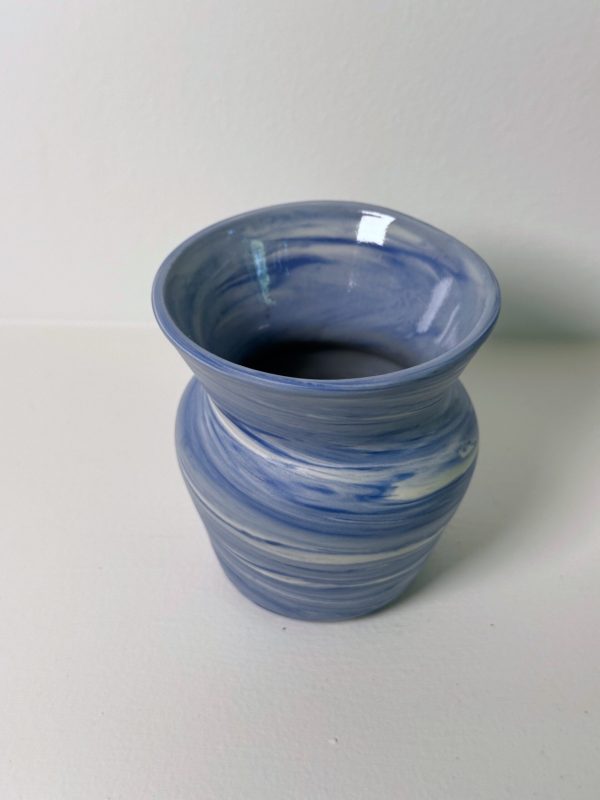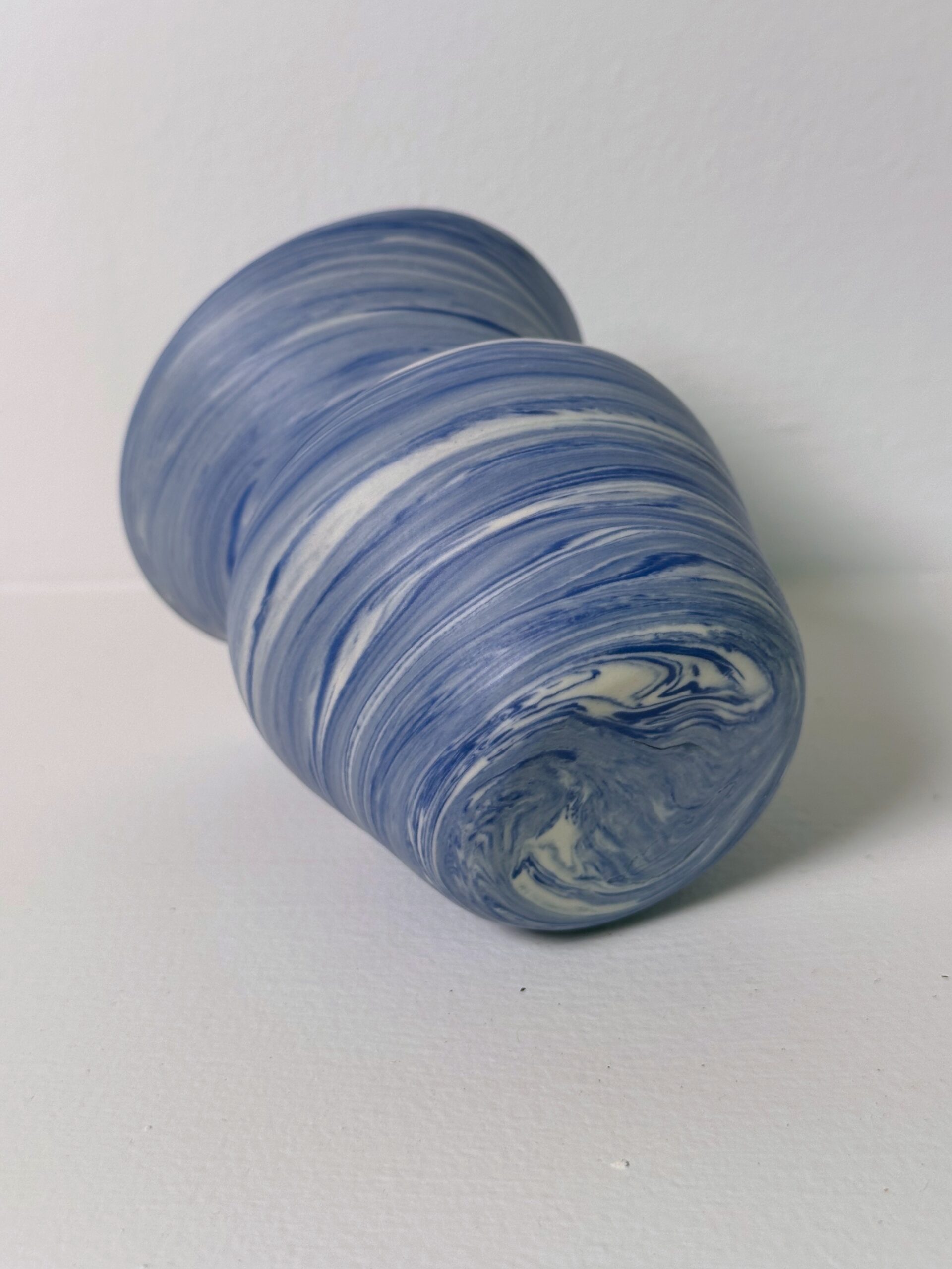 Marbled blue and white porcelain vase, wheel-thrown from marbled blue and white porcelain and coated with “Transparent” glaze.