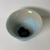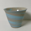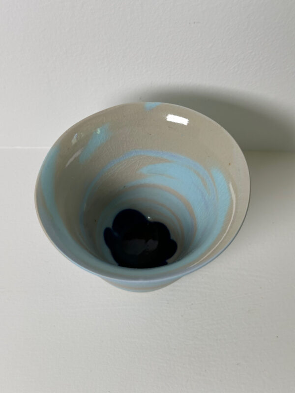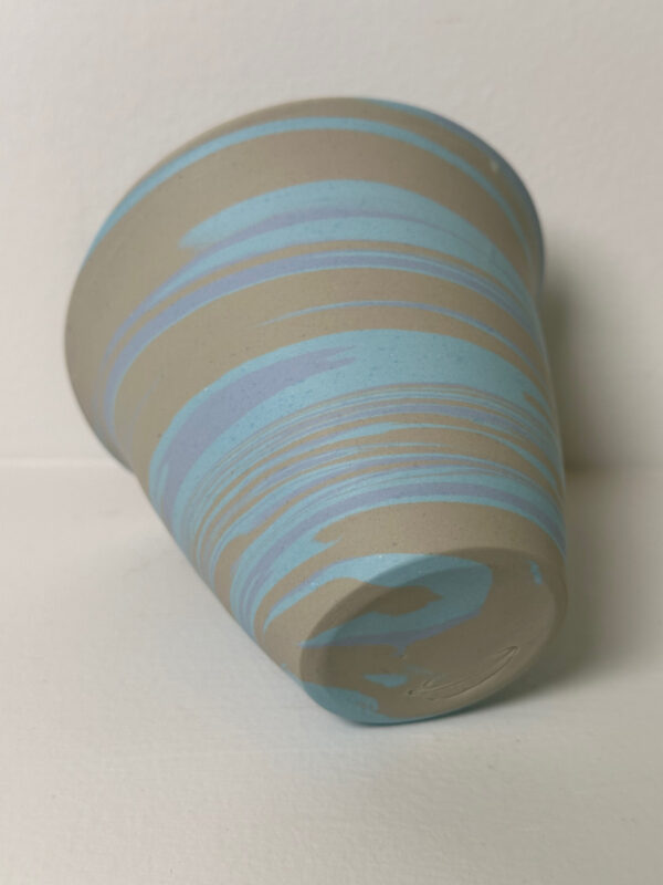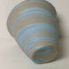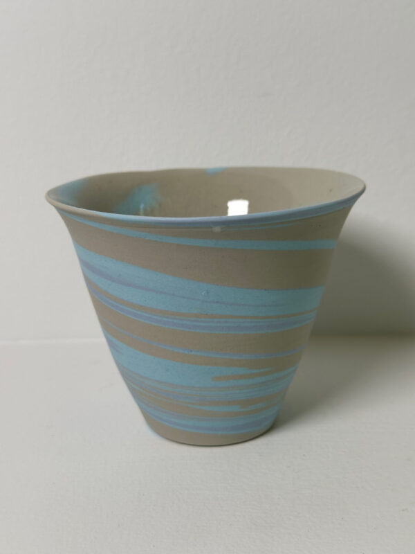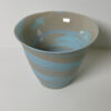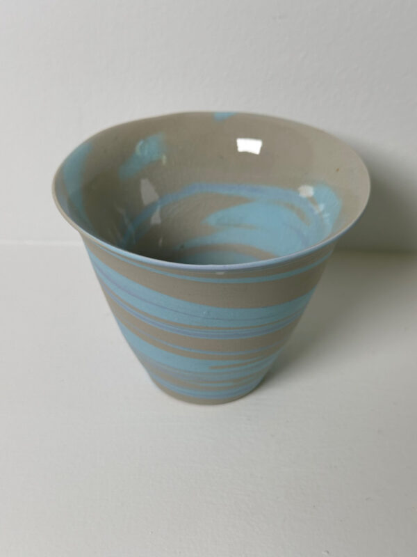Marbled blue, crimson and gray porcelain vessel, wheel-thrown from marbled blue, crimson and gray porcelain and coated with “Transparent” glaze.