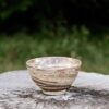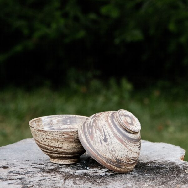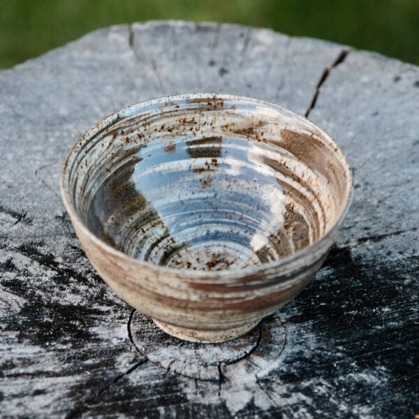 Marbled stoneware cereal/dessert/soup bowl, wheel-thrown from marbled speckled, black and red stoneware and coated with “Crystal Clear” glaze.