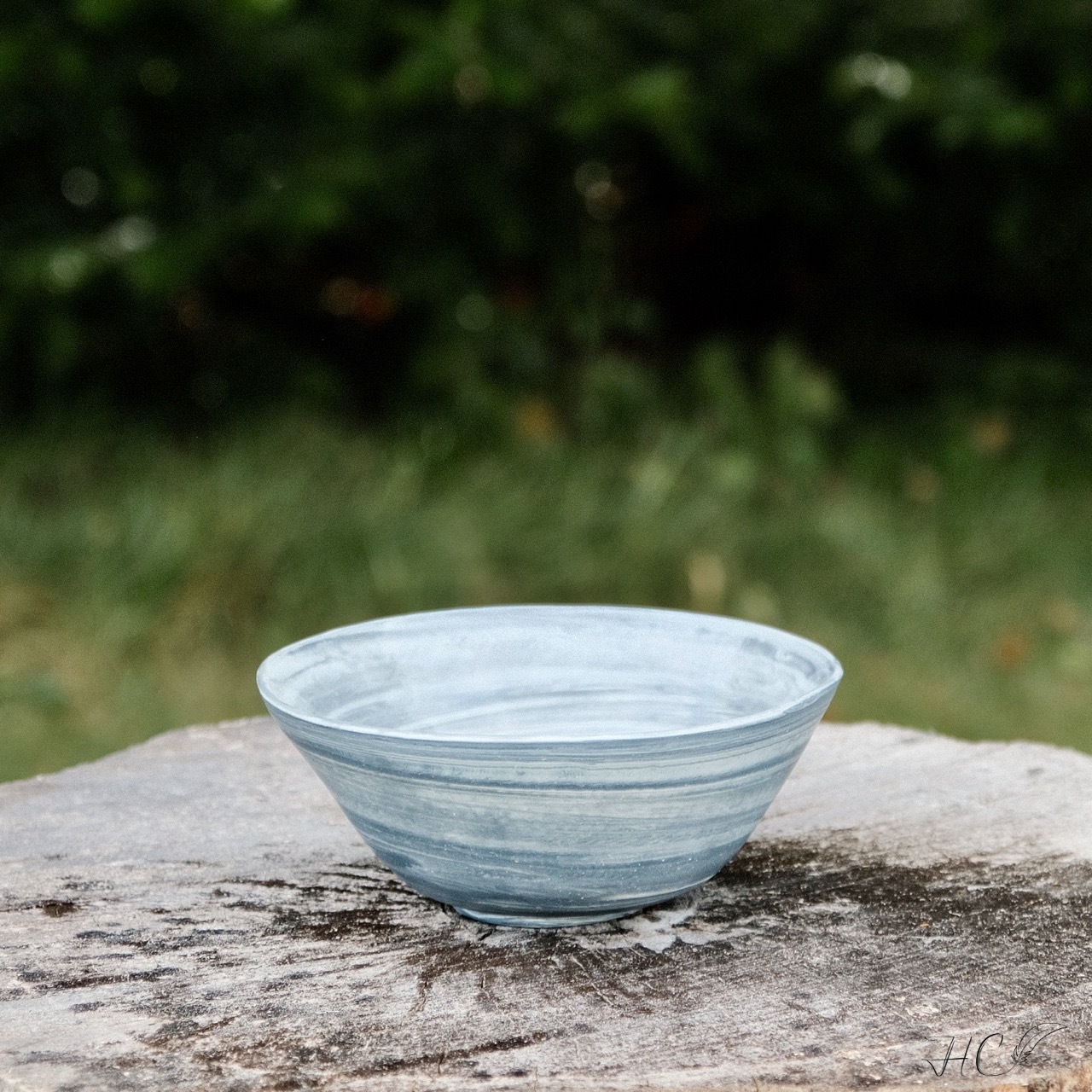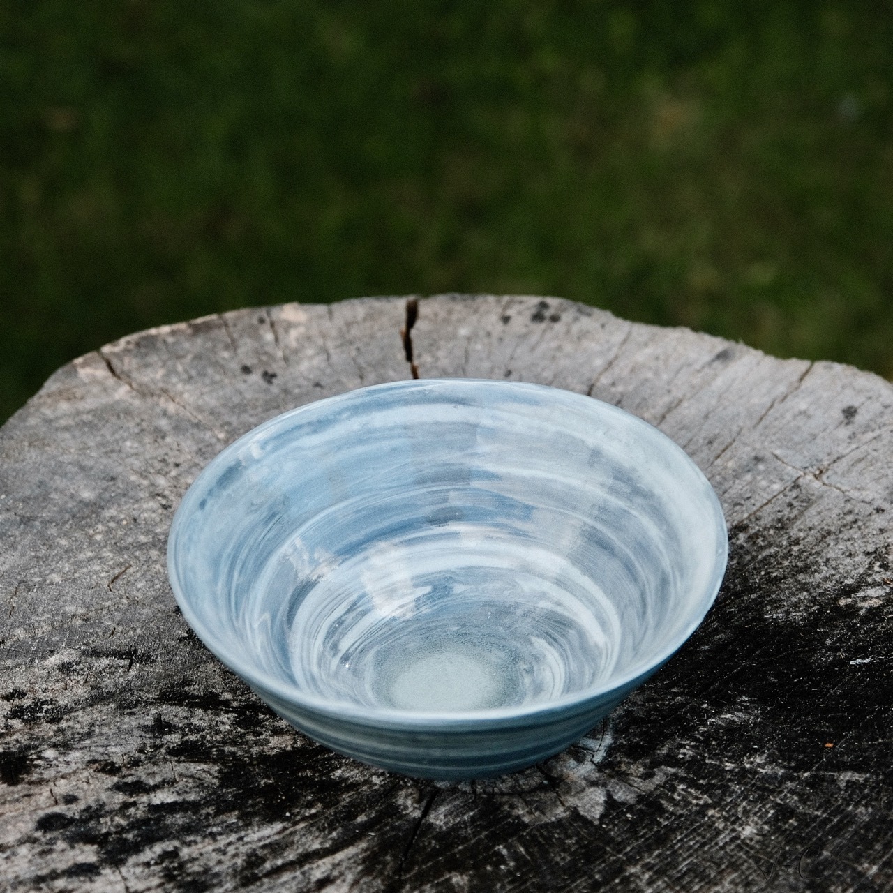 Marbled porcelain bowl, wheel-thrown from marbled black and white porcelain and coated with “Crystal Clear” glaze.