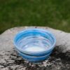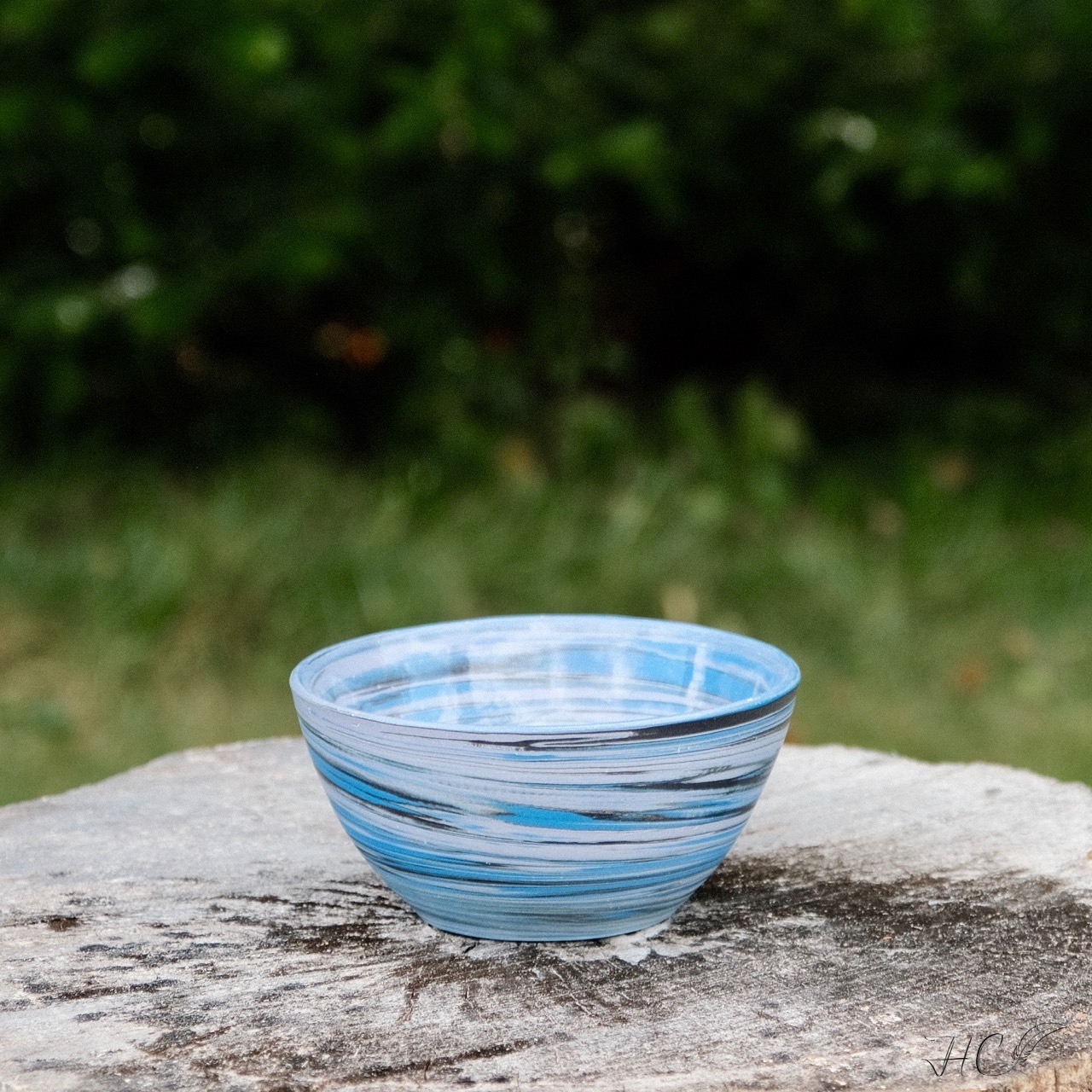 Marbled porcelain bowl, wheel-thrown from marbled blue, black, velvet and white porcelain and coated with “Crystal Clear” glaze.