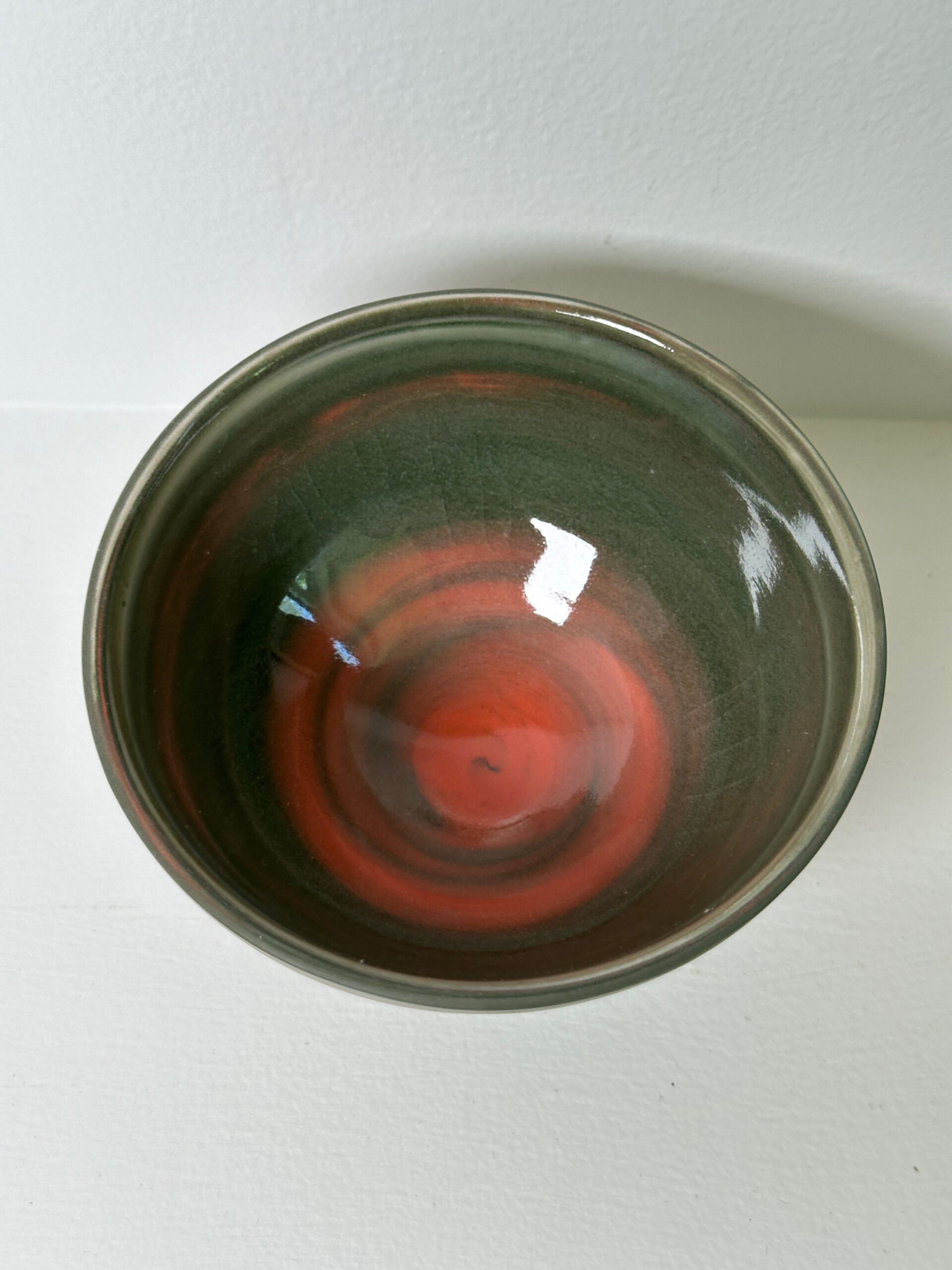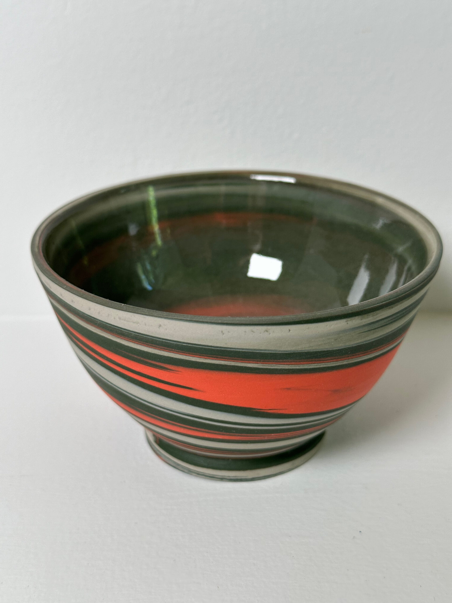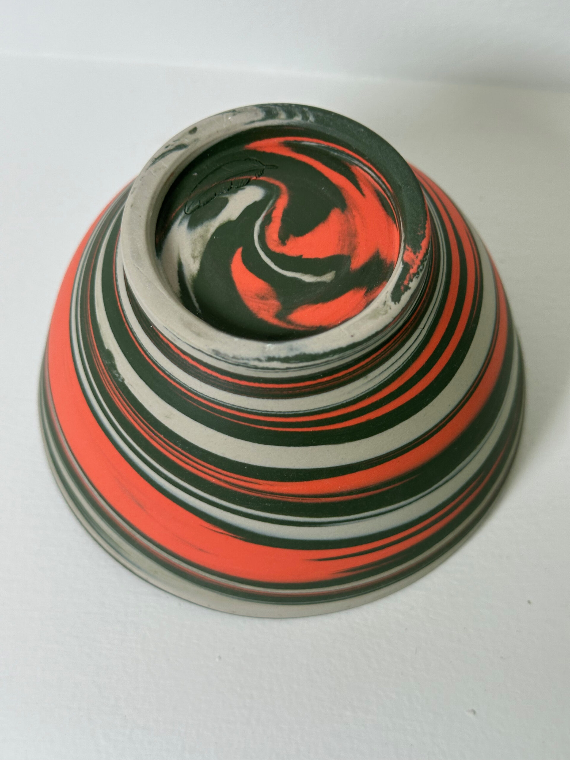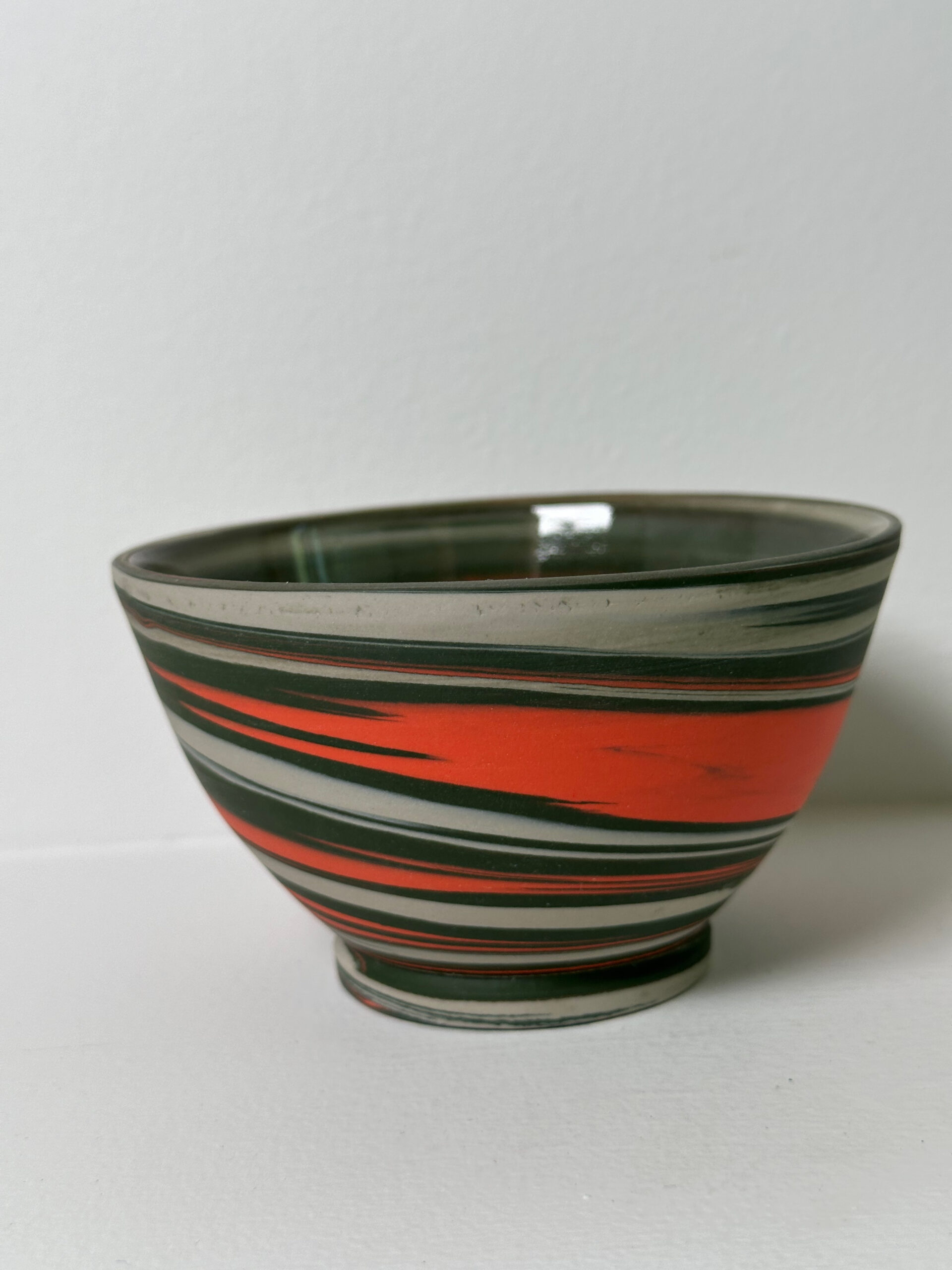 Marbled green, mango, white and black porcelain bowl, wheel-thrown from marbled green, mango, white and black porcelain and coated with “Transparent” glaze.