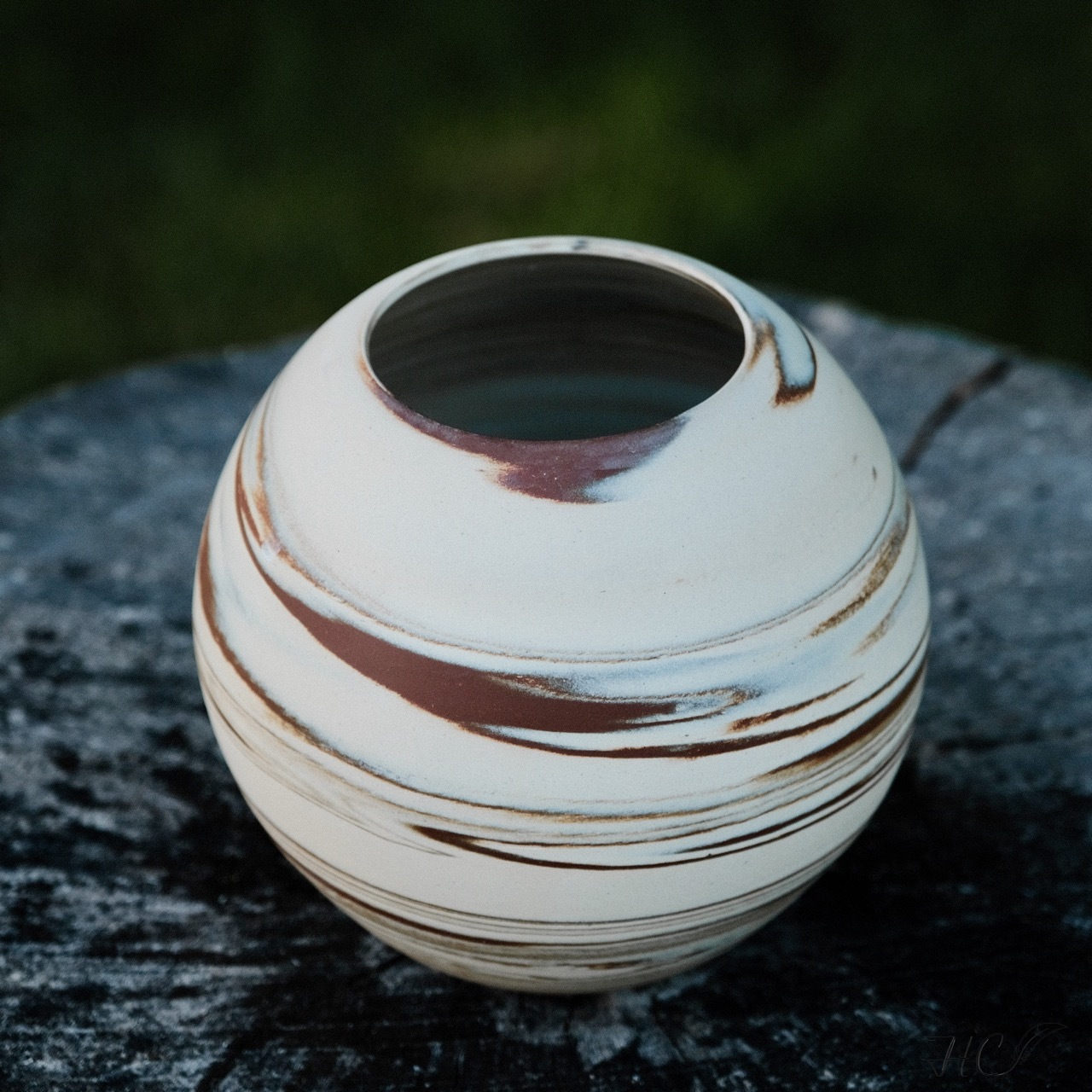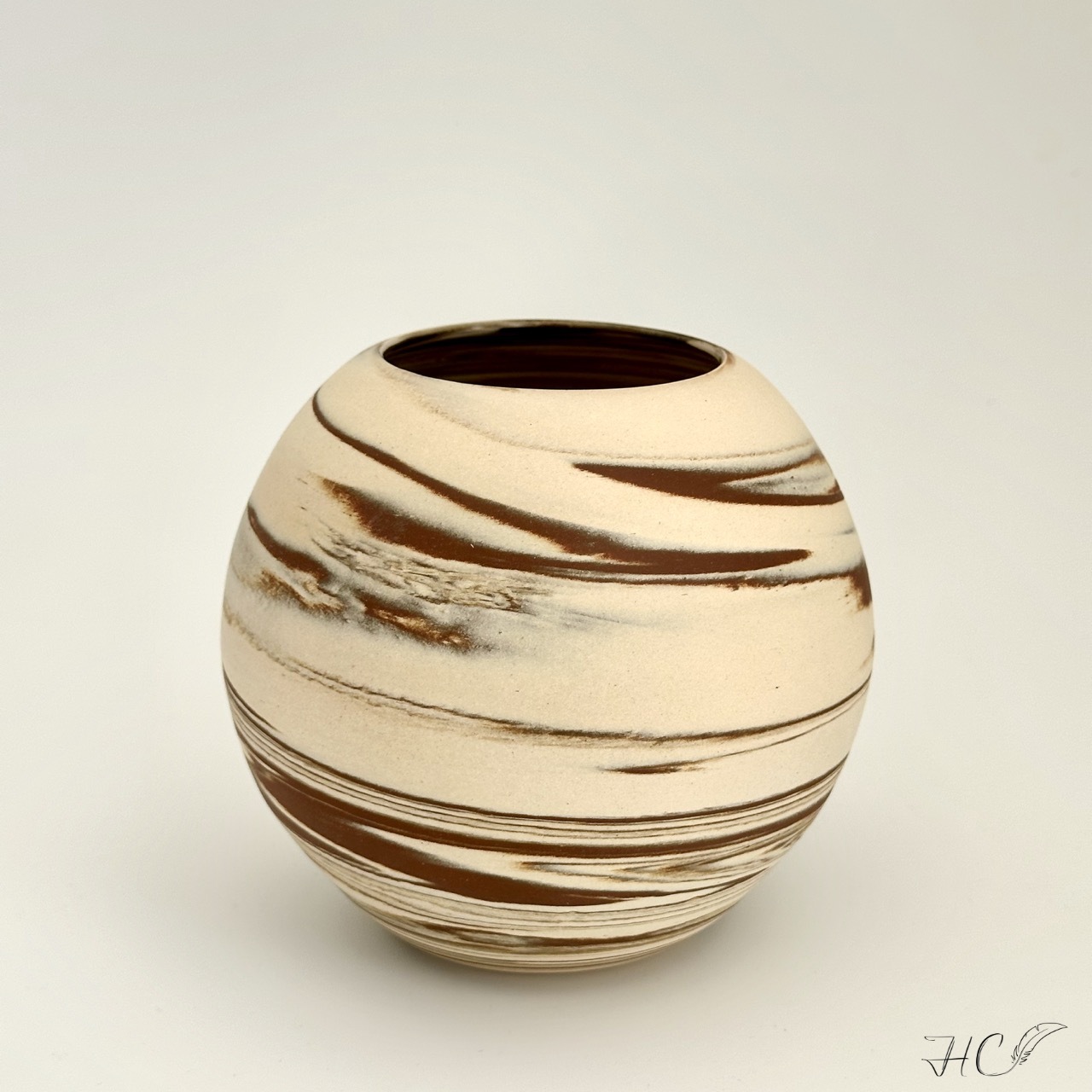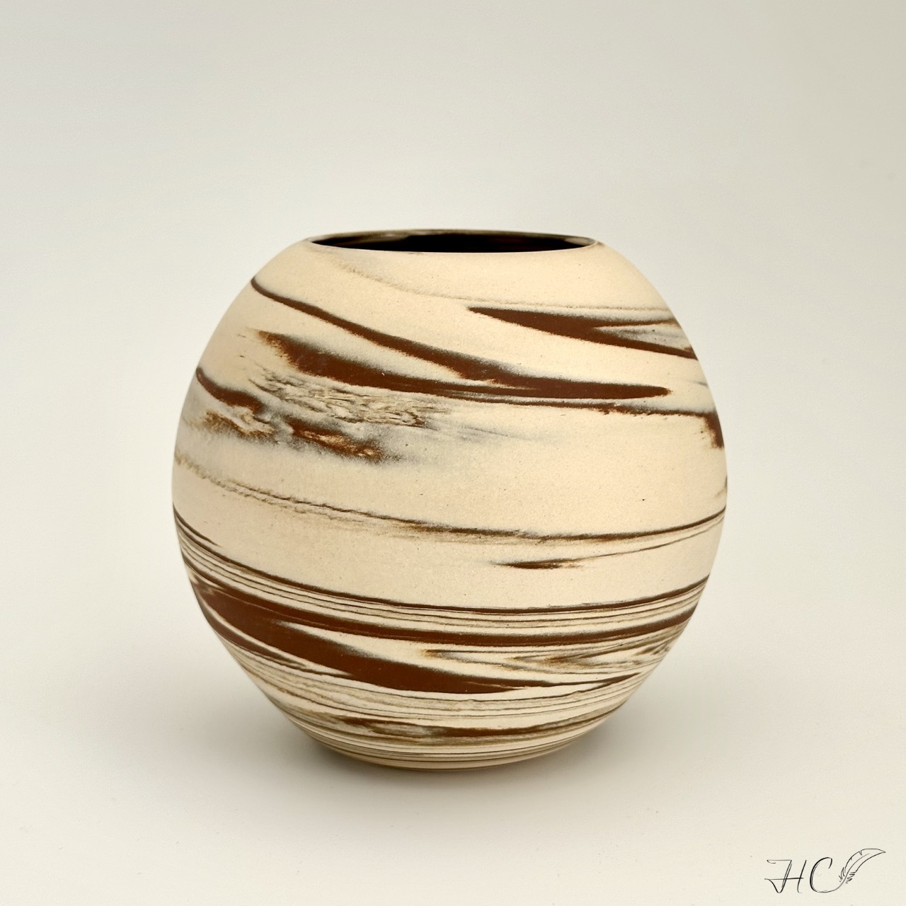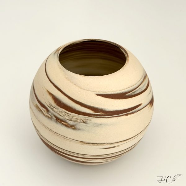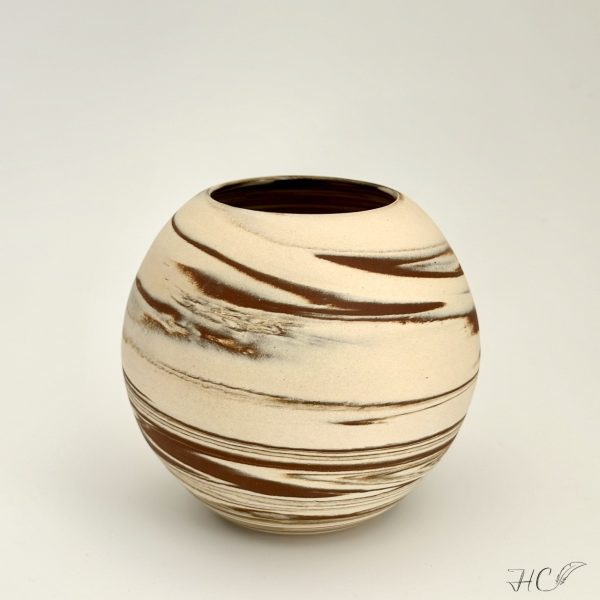Marbled stoneware moon jar/orb vase, wheel-thrown from marbled white and red stoneware and coated with “Crystal Clear” glaze.