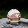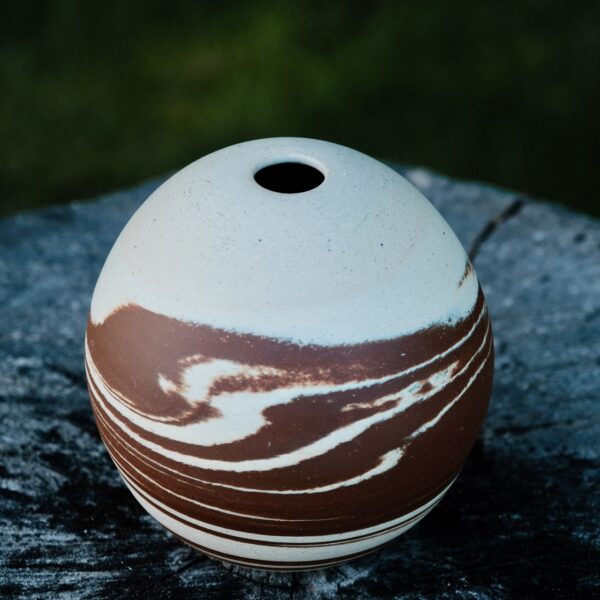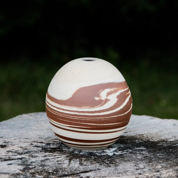 Marbled stoneware moon jar/orb vase, wheel-thrown from marbled white and red stoneware and coated with “Crystal Clear” glaze.