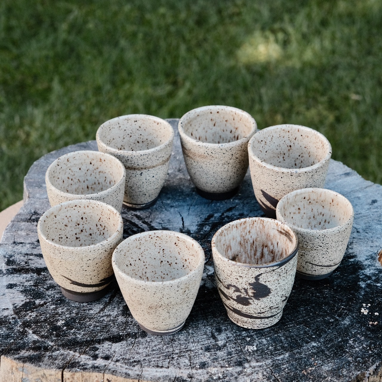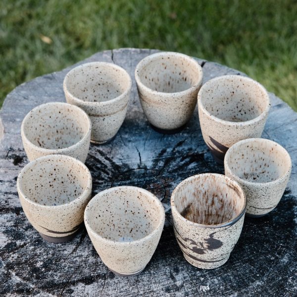 Marbled speckled stoneware cup/tumbler, wheel-thrown from marbled black and speckled stoneware and coated with “Crystal Clear” glaze.
