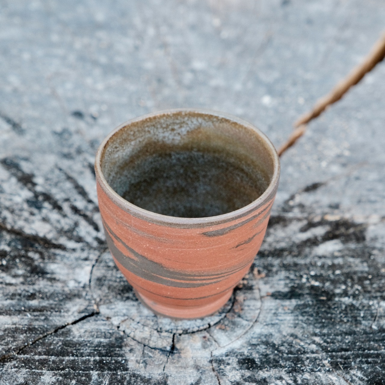 Marbled stoneware cups, wheel-thrown from marbled red and black stoneware and coated with “Crystal Clear” glaze.