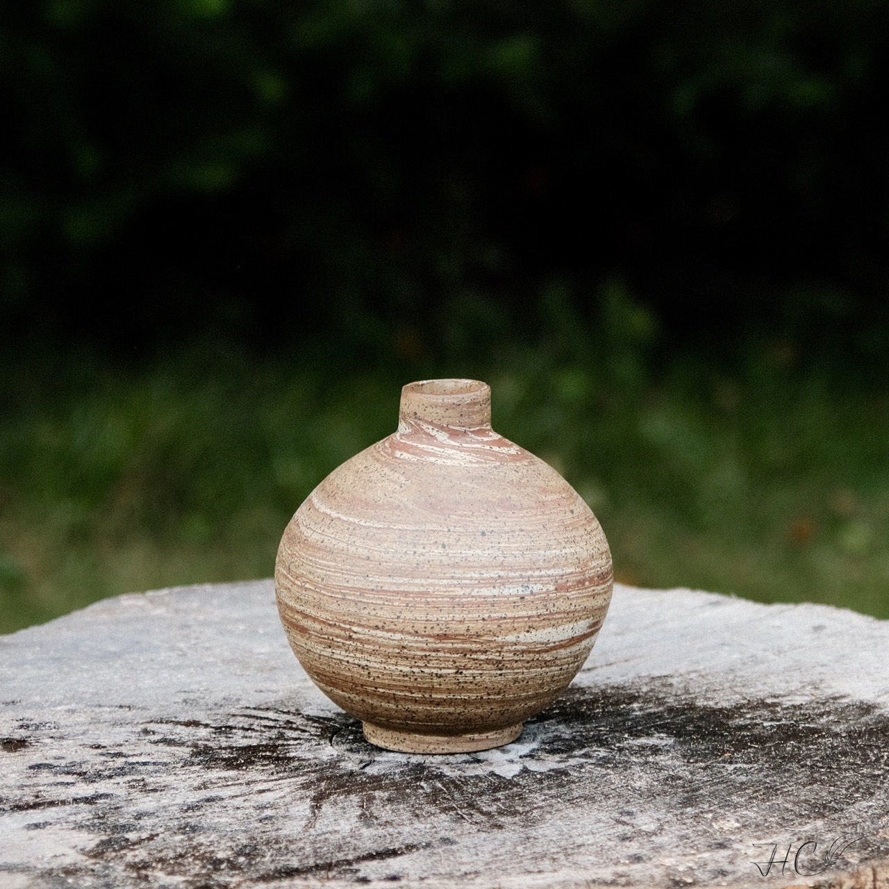 Marbled stoneware bottle/balloon/vase, wheel-thrown from marbled speckled and red stoneware and coated with “Crystal Clear” glaze.