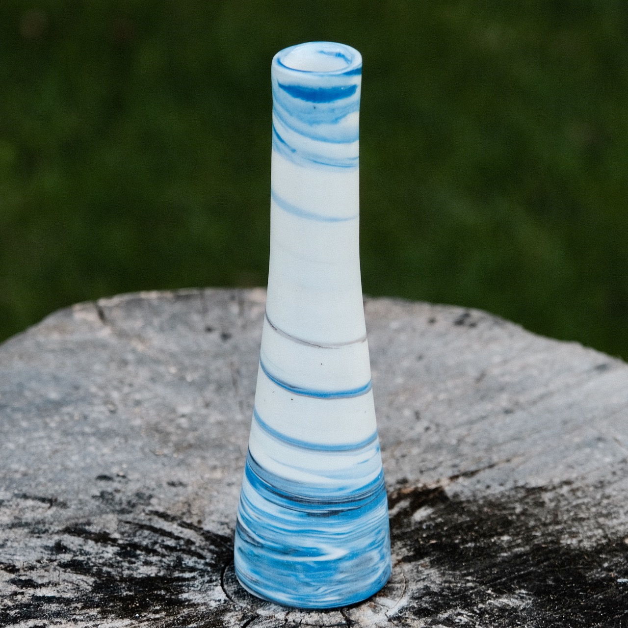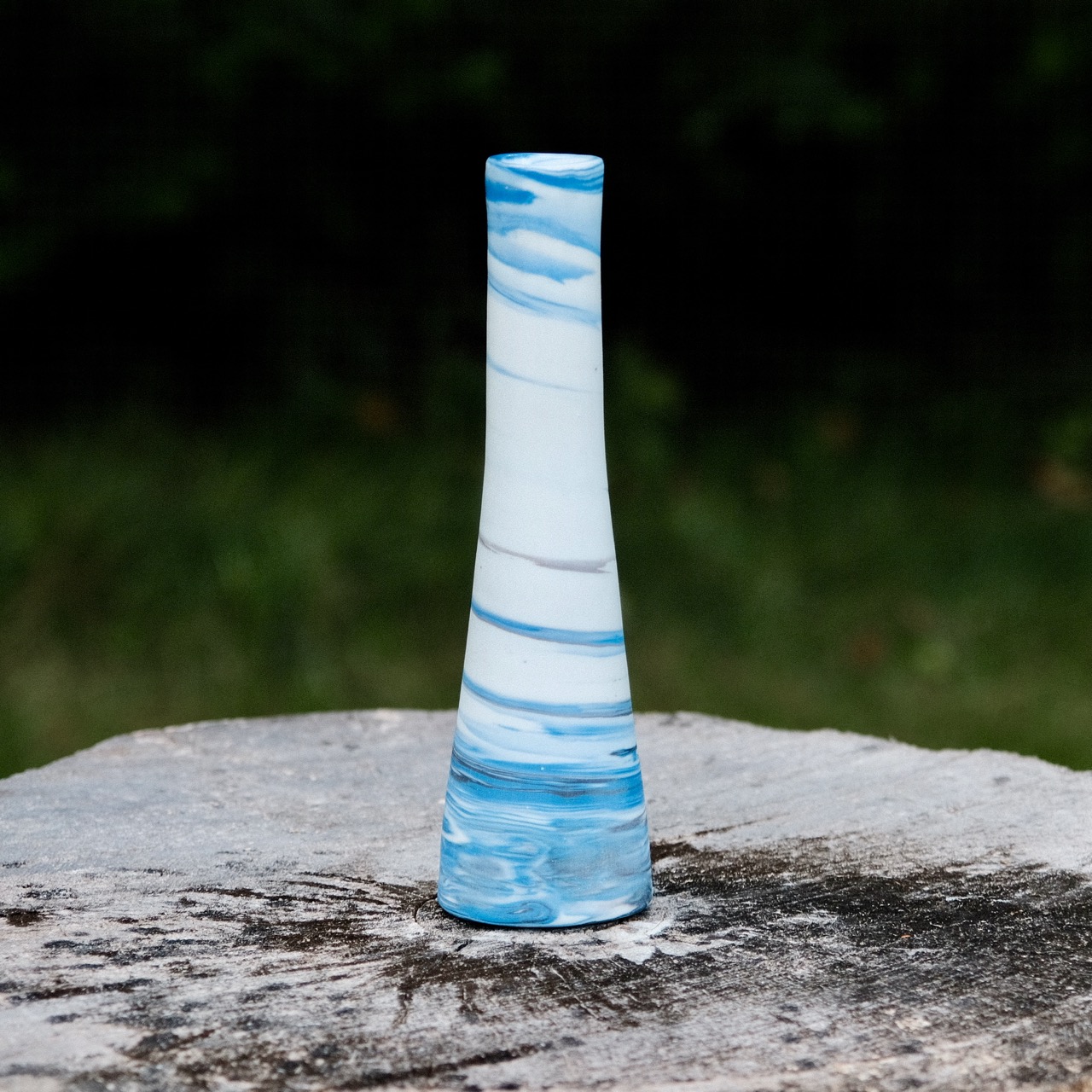 Marbled vase, wheel-thrown from marbled white, blue and black porcelain and coated with “Crystal Clear” glaze.