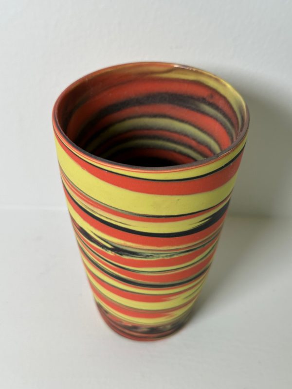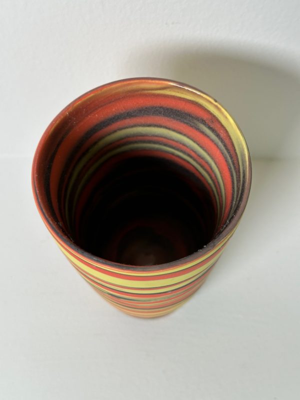 Marbled yellow, mango and black porcelain tumbler/vase/vessel, wheel-thrown from marbled yellow, mango and black porcelain and coated with “Transparent” glaze.