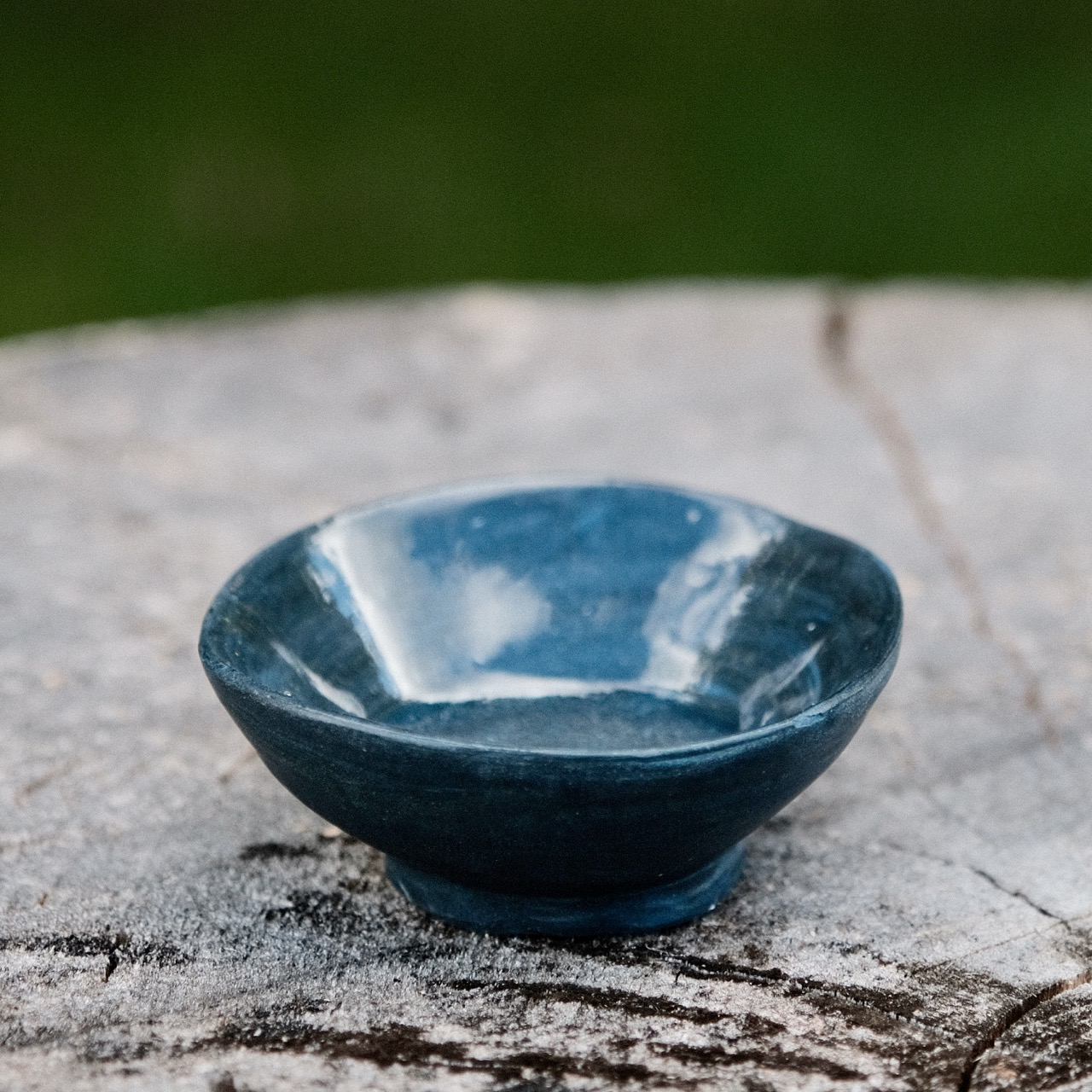 Mini porcelain bowl, wheel-thrown from blue porcelain and coated with “Crystal Clear” glaze.