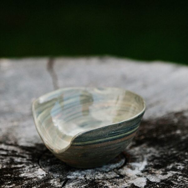Mini marbled porcelain bowl, wheel-thrown from marbled yellow, black, white and mango porcelain and coated with “Crystal Clear” glaze.