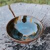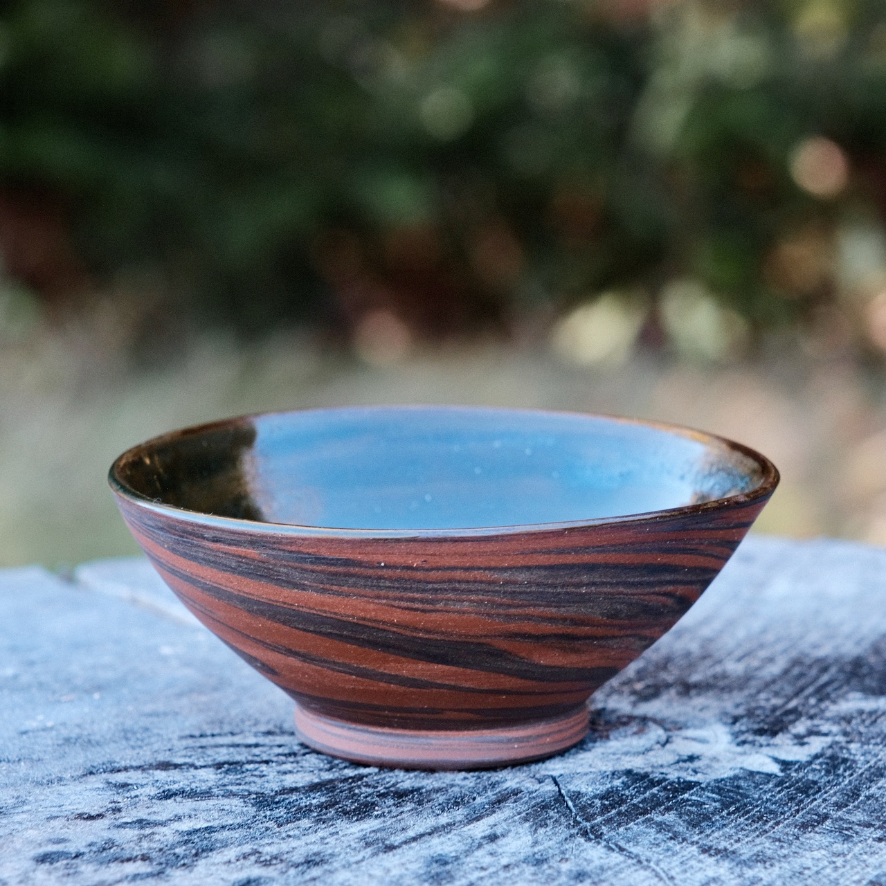 Porcelain bowl, wheel-thrown from marbled red and black stoneware and coated with “Crystal Clear” glaze.
