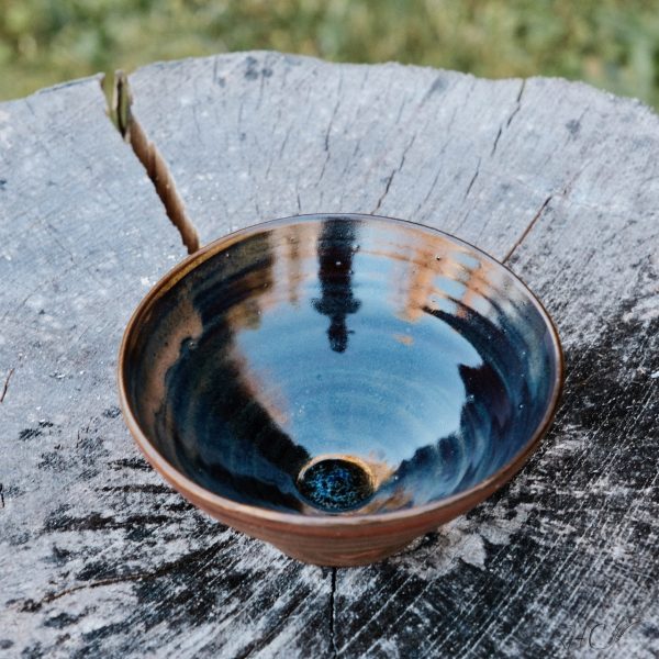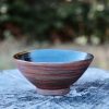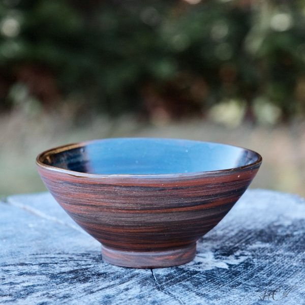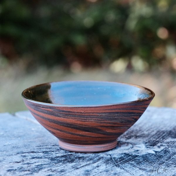 Marbled stoneware bowl, wheel-thrown from marbled red and black stoneware and coated with “Crystal Clear” glaze.