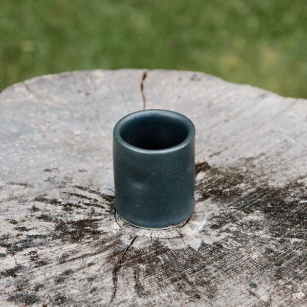 Sake bottle (tokkuri) and 4 cups, wheel-thrown from speckled stoneware and coated with “Charcoal” glaze.