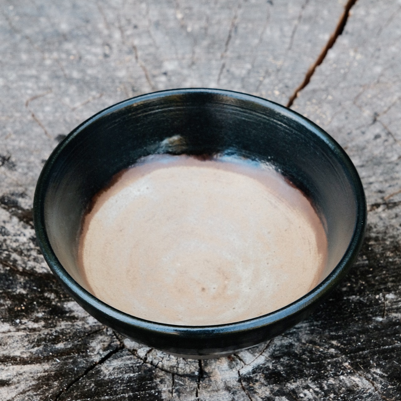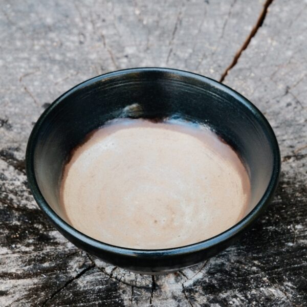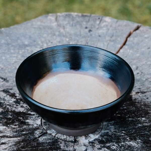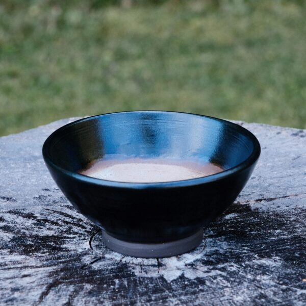 Stoneware bowl, wheel-thrown from black stoneware and hand-painted with “Alabaster” and “Tiger’s Eye” glazes.