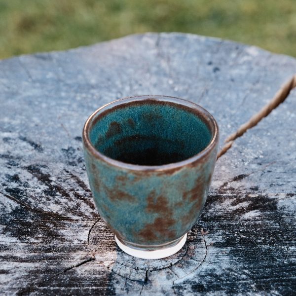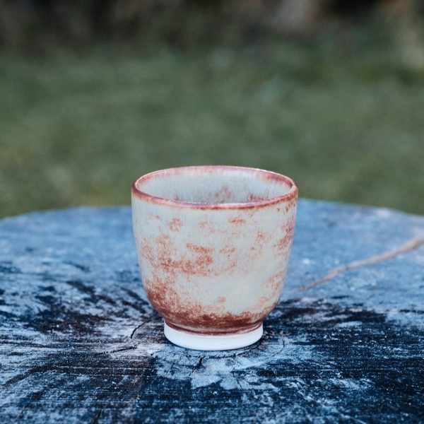 Stoneware cup/tumbler, wheel-thrown from white stoneware and hand-painted with “Hibiscus Matte Shino”, “Oolong Gloss Shino”, “Chai Gloss Shino” and “Matcha Gloss Shino” glazes.