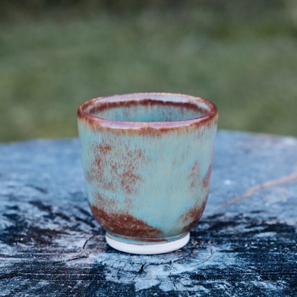 Stoneware cup/tumbler, wheel-thrown from white stoneware and hand-painted with “Oolong Gloss Shino” glaze.