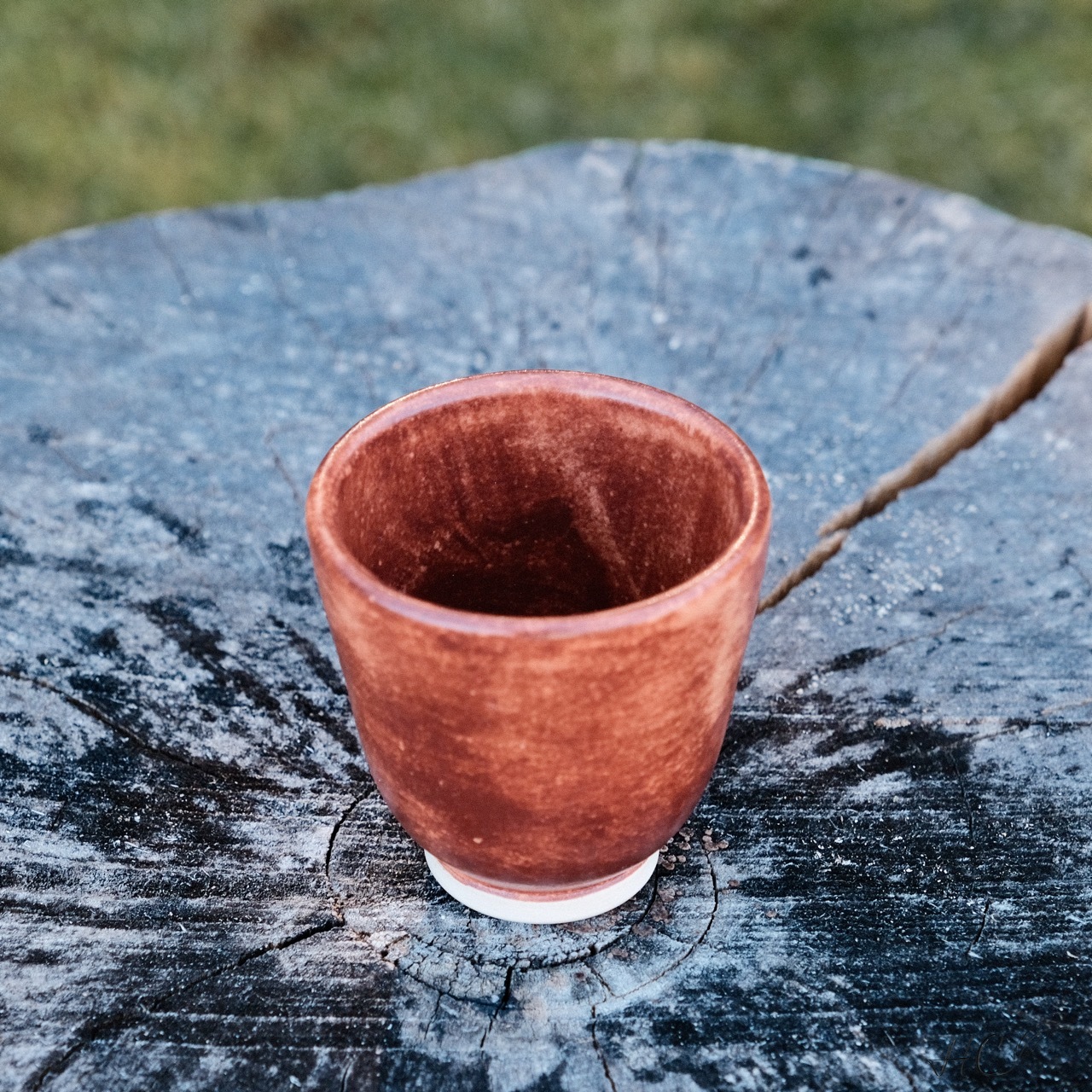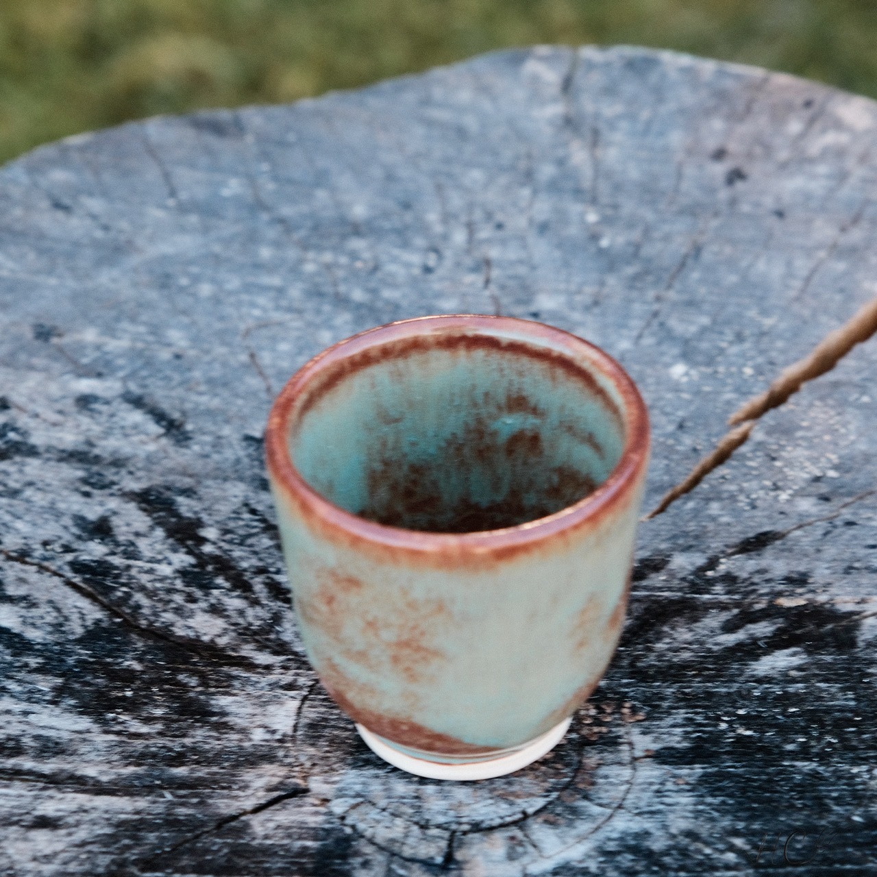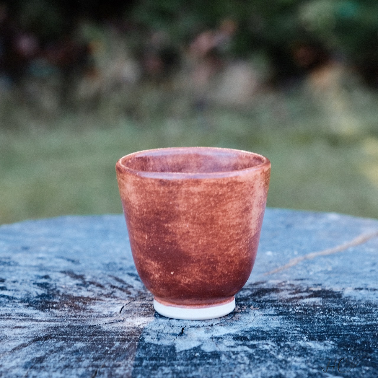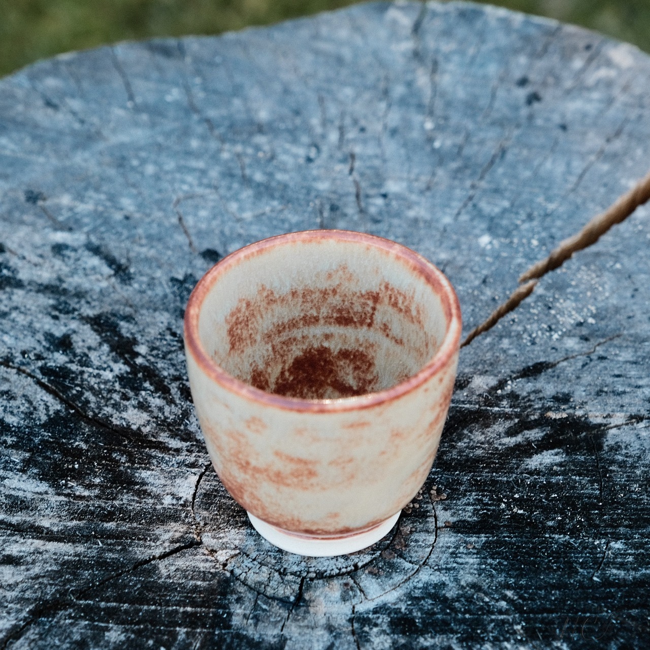 Stoneware cup/tumbler, wheel-thrown from white stoneware and hand-painted with “Hibiscus Matte Shino”, “Oolong Gloss Shino”, “Chai Gloss Shino” and “Matcha Gloss Shino” glazes.