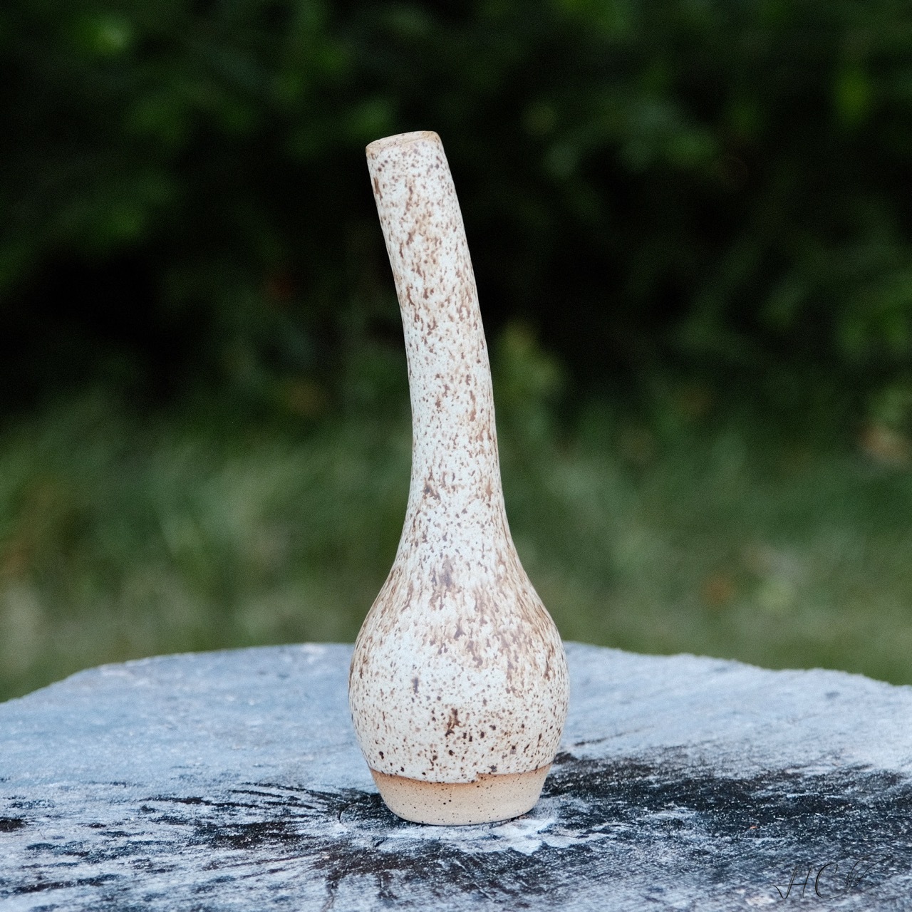Stoneware leaning vase, wheel-thrown from mixed stoneware and hand-painted with “Winter Wood” glaze.