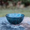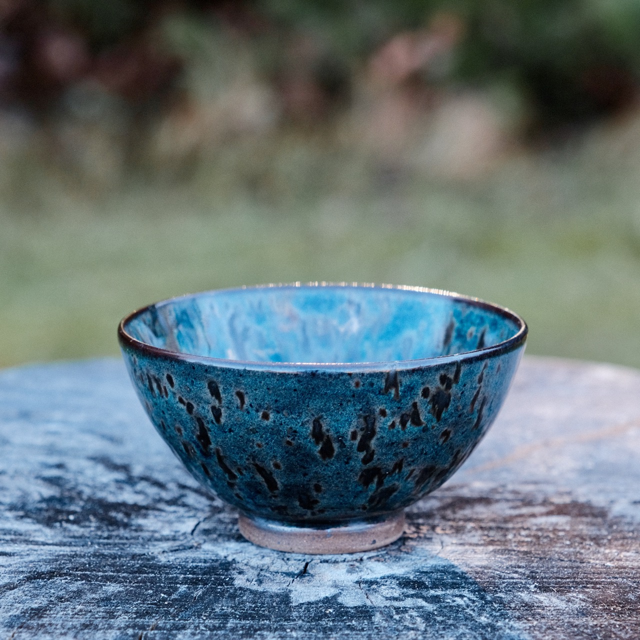 Stoneware tea cup, wheel-thrown from dark stoneware and hand-painted with “Midnight Rain” glaze.