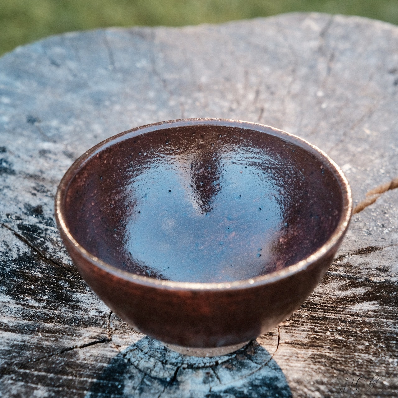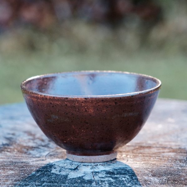 Stoneware tea cup, wheel-thrown from dark stoneware and hand-painted with “Hibiscus Matte Shino” glaze.