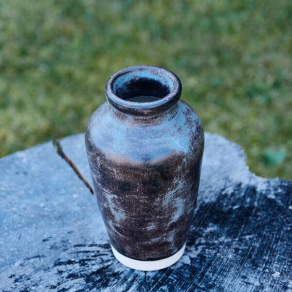 Stoneware vase, wheel-thrown from white stoneware and hand-painted with “Acai Matte Shino” glaze.