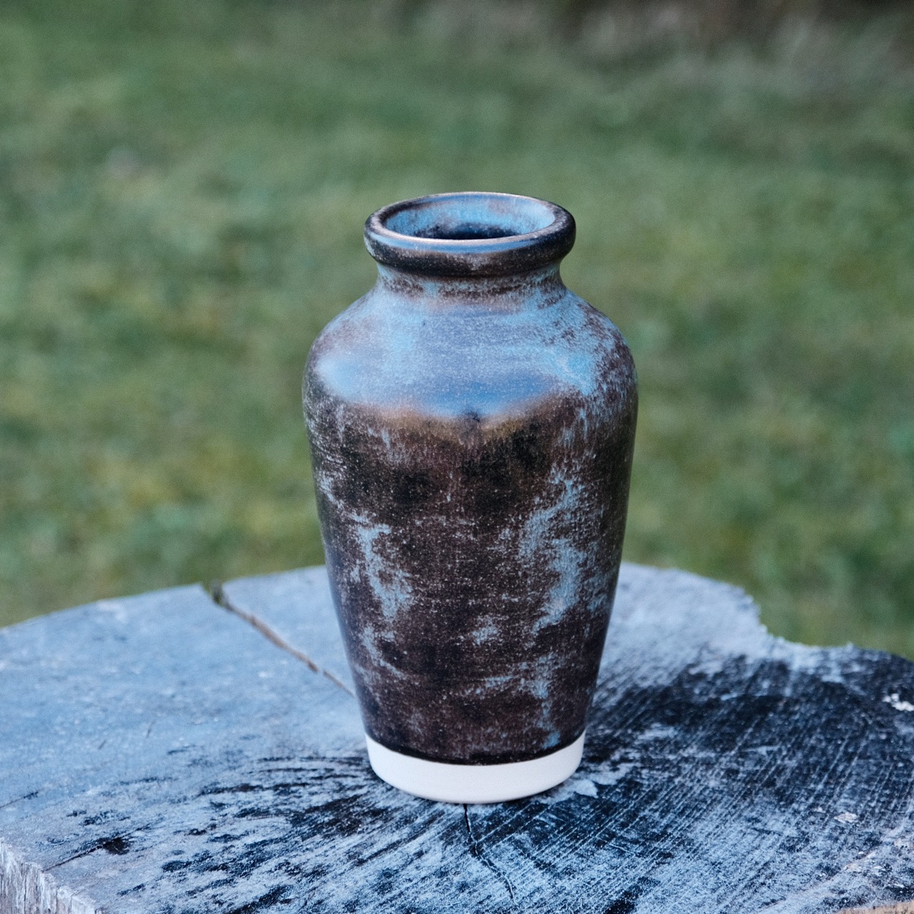 Stoneware vase, wheel-thrown from white stoneware and hand-painted with “Acai Matte Shino” glaze.