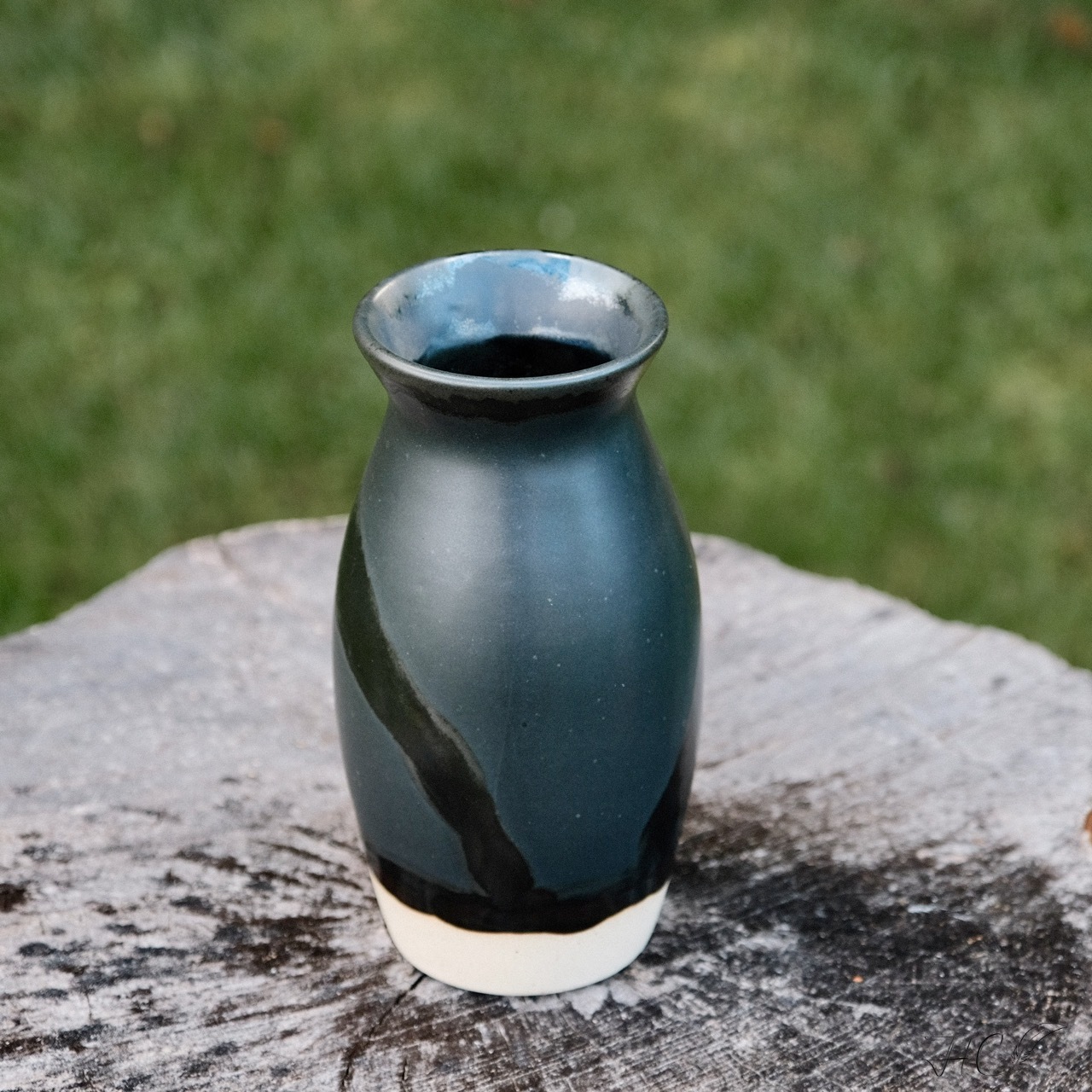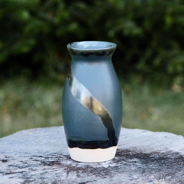 Stoneware tall vase, wheel-thrown from white stoneware and hand-painted with “Crystal Clear”, “Charcoal” and “Hematite” glazes.