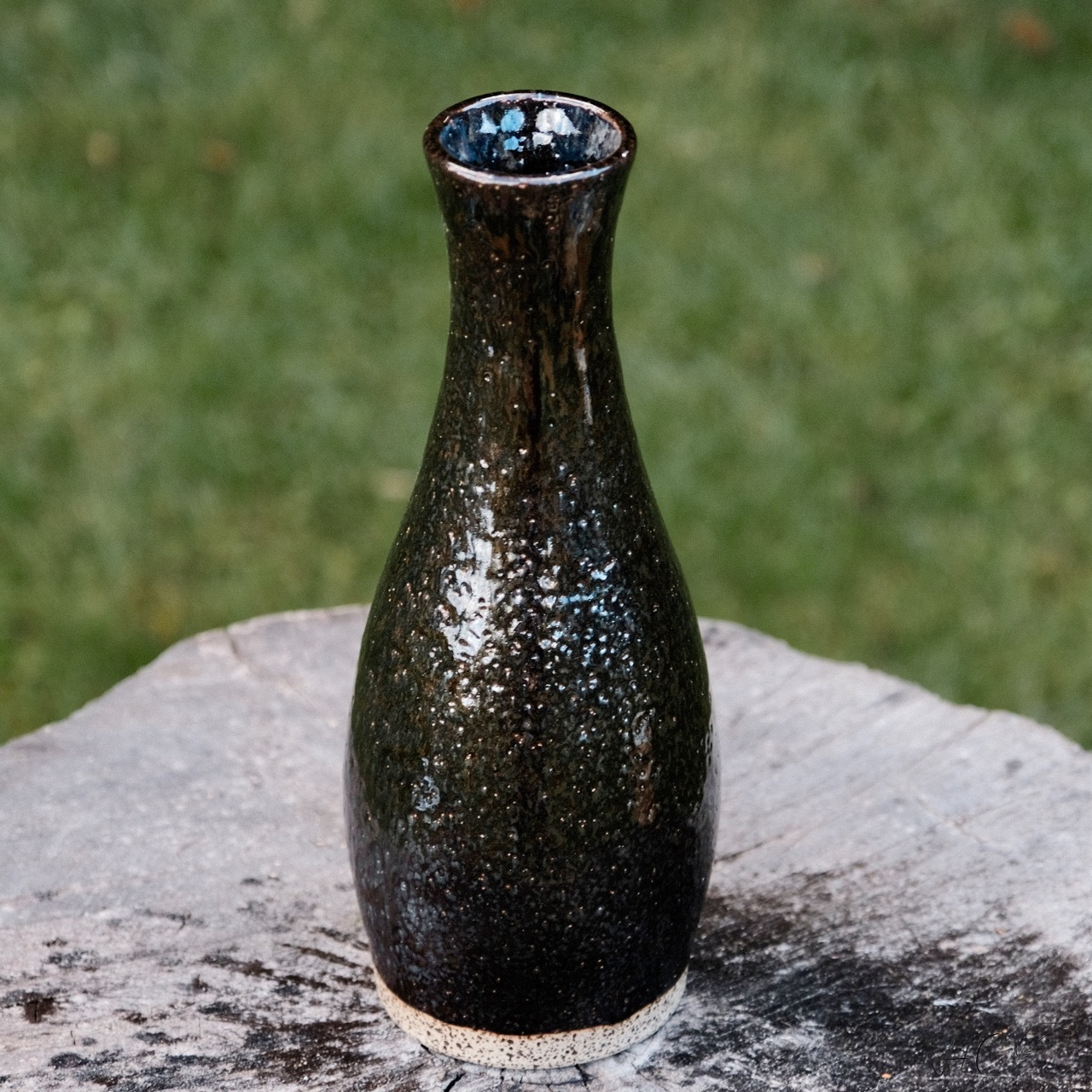 Tall stoneware vase, wheel-thrown from white stoneware and coated with “Starry Night” glaze.