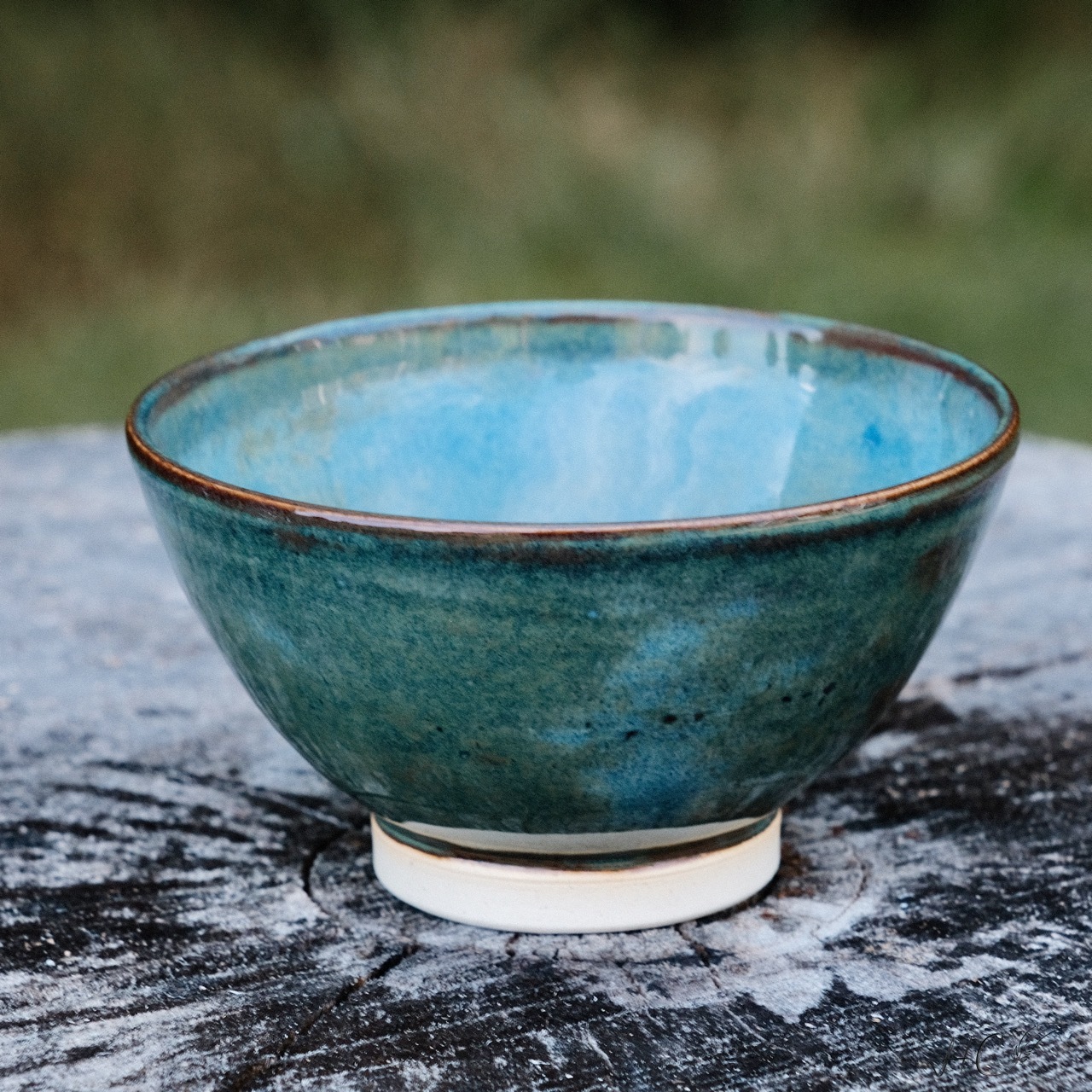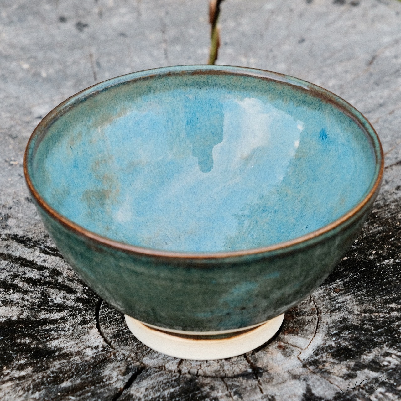 Stoneware tea/dessert bowl, wheel-thrown from white stoneware and hand-painted with “Stoned Denim” glaze.