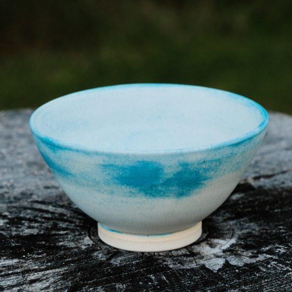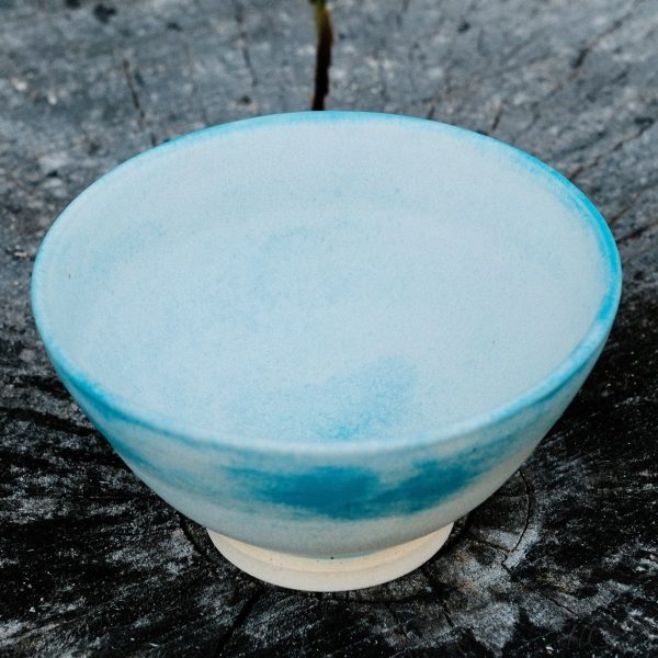 Stoneware tea/dessert/soup bowl, wheel-thrown from white stoneware and hand-painted with “Weathered Blue” glaze.