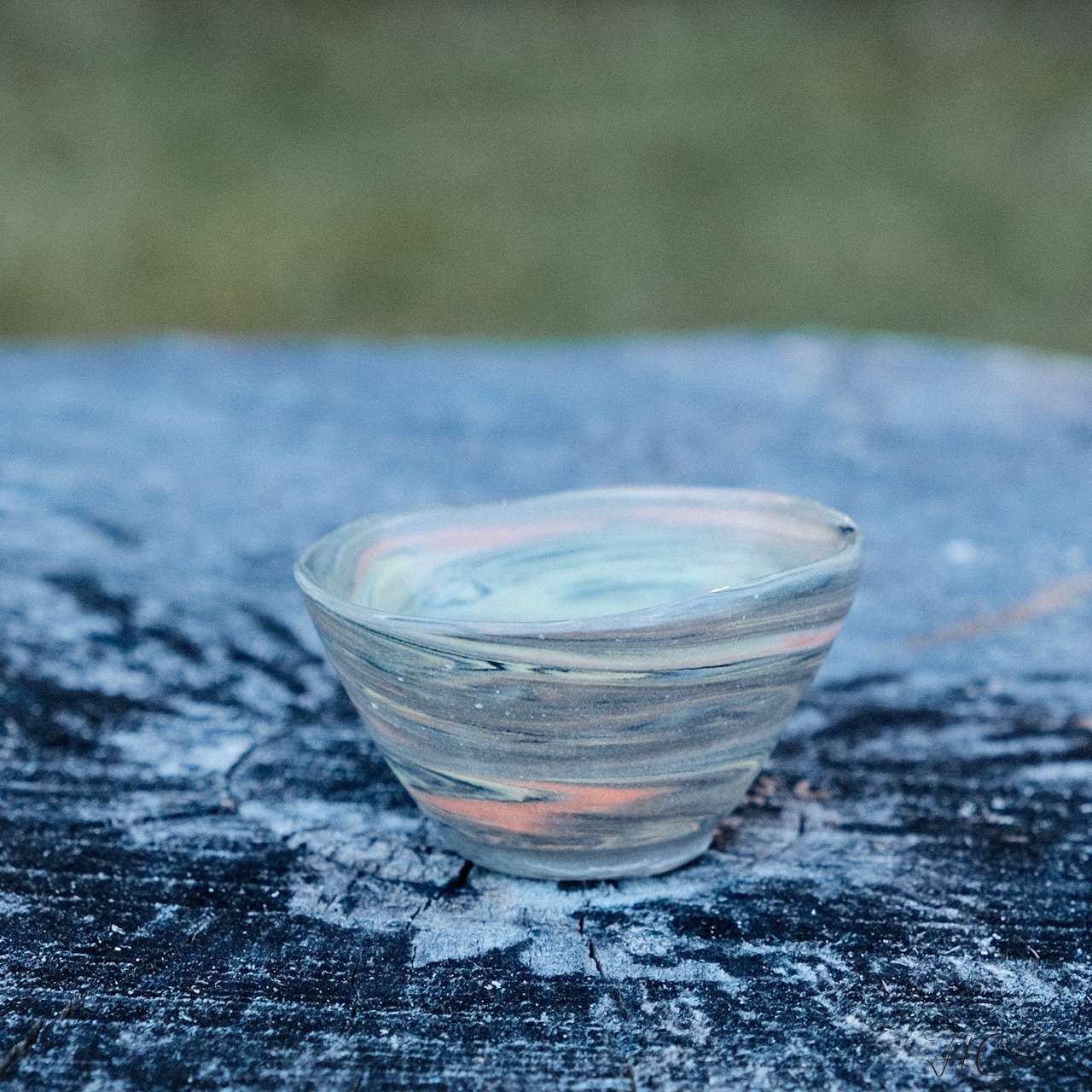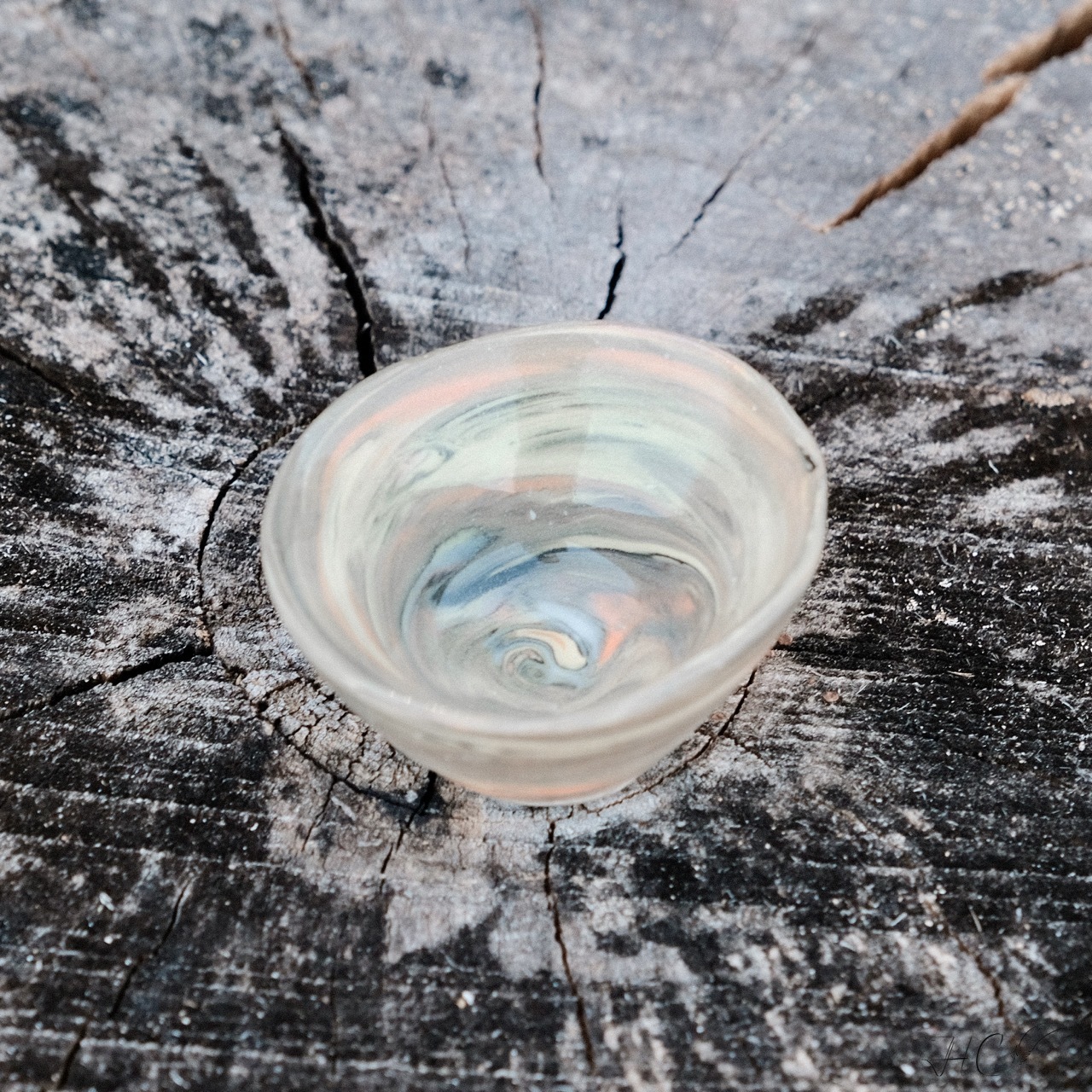 Uneven marbled mini porcelain bowl, wheel-thrown from marbled mango, black, white and yellow porcelain and coated with “Crystal Clear” glaze.
