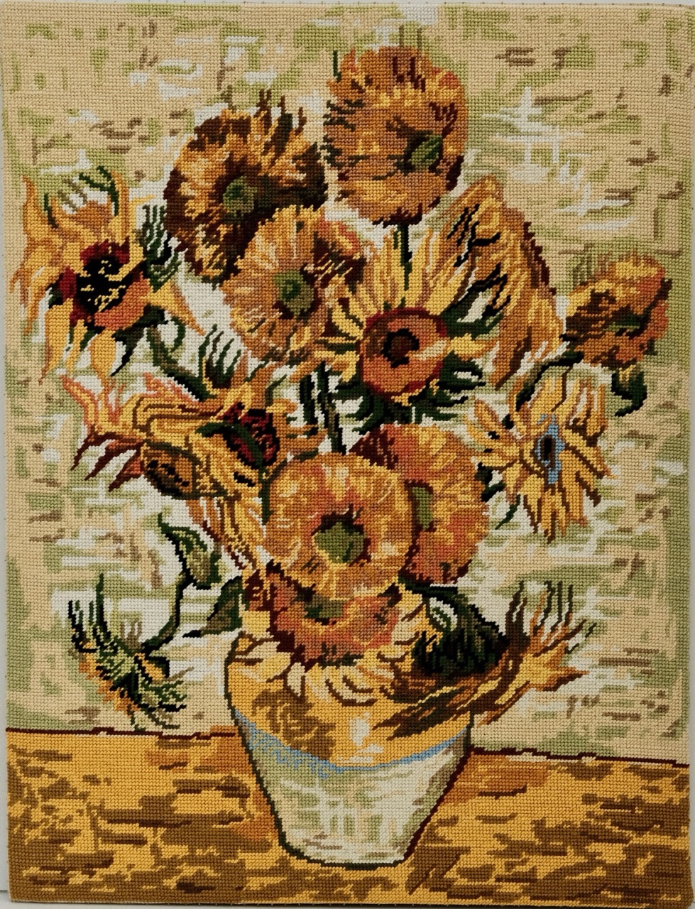 Unframed Sunflowers (Les Tournesols d’apres, based on Van Gogh’s painting) is a 100% cotton canvas created by SEG de Paris, manufactured in France. The needlepoint was meticulously half cross stitched by hand over many months using DMC pearl cotton threads. The final product was stretched but left unframed.