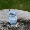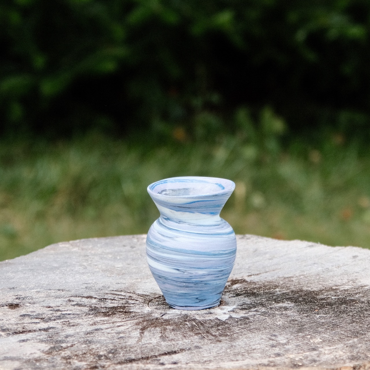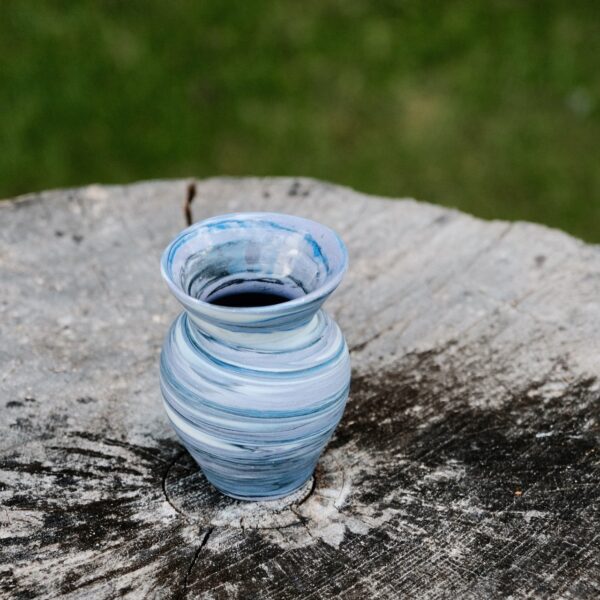Marbled porcelain vase, wheel-thrown from marbled white, blue, black and lavender porcelain and coated with “Crystal Clear” glaze.