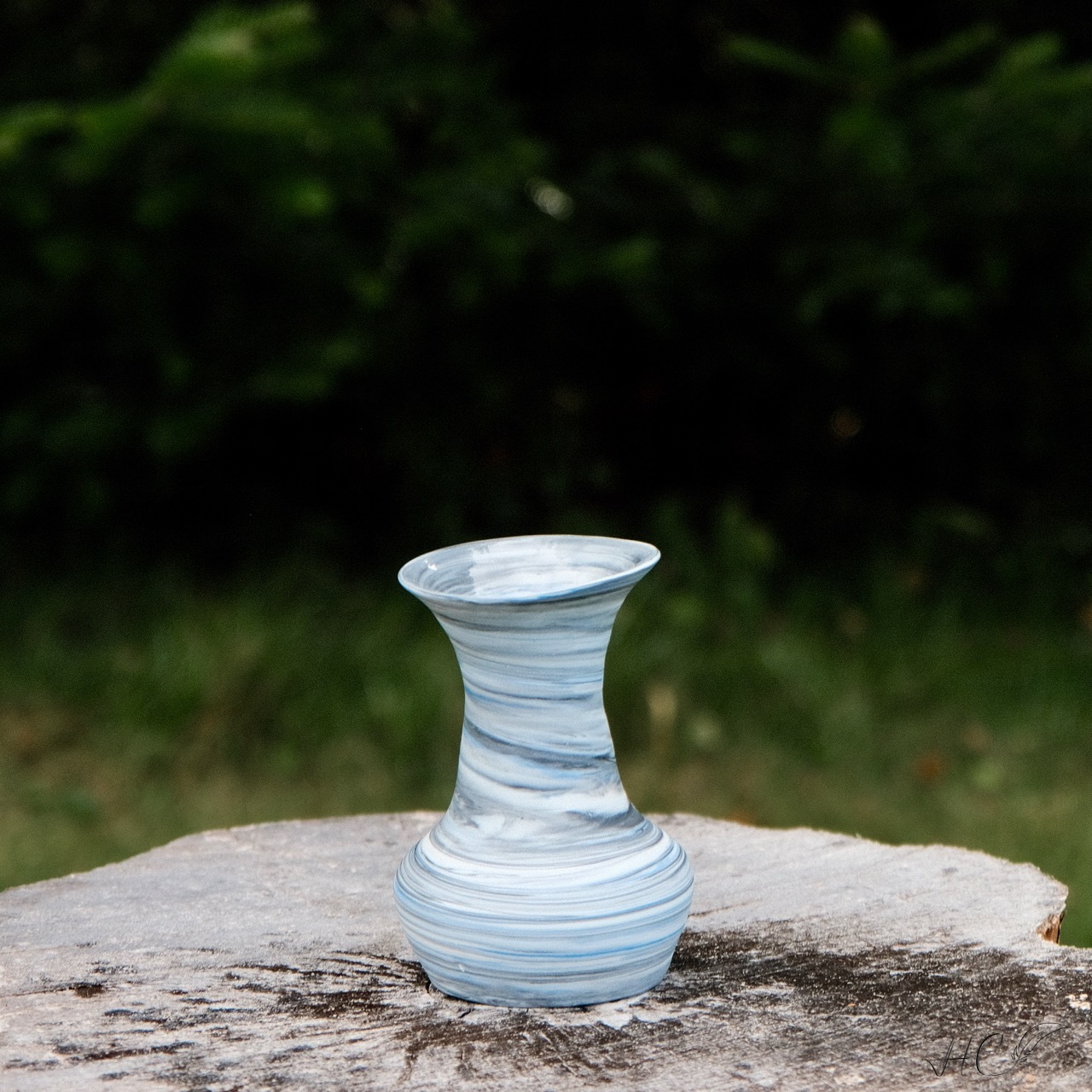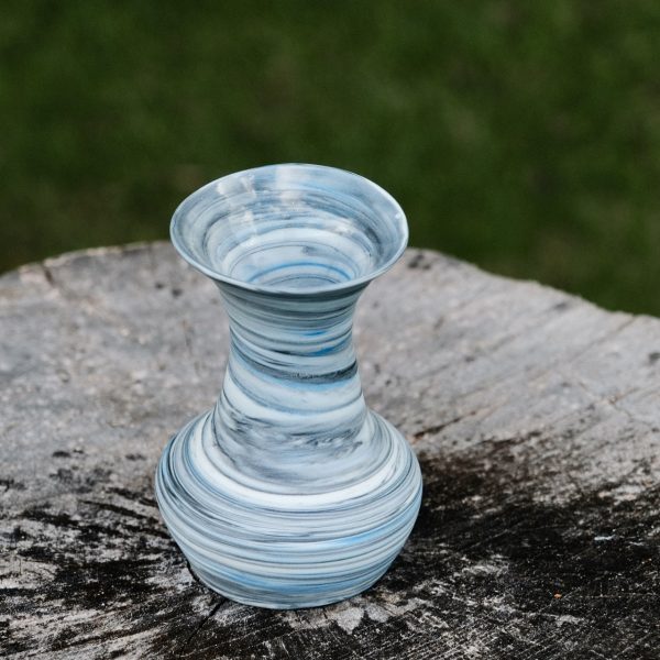 Wonky marbled porcelain vase, wheel-thrown from marbled white, blue and black porcelain and coated with “Crystal Clear” glaze.